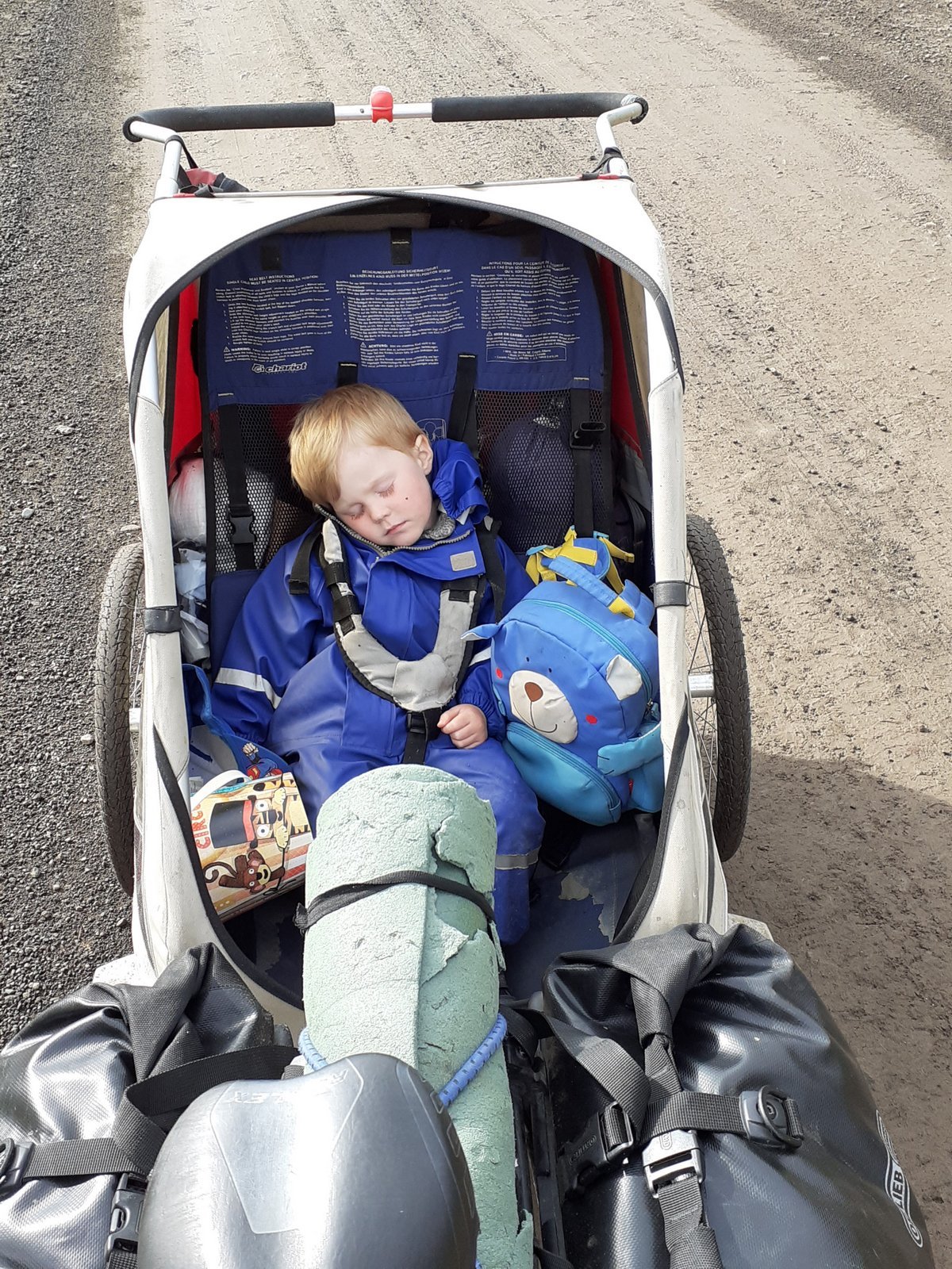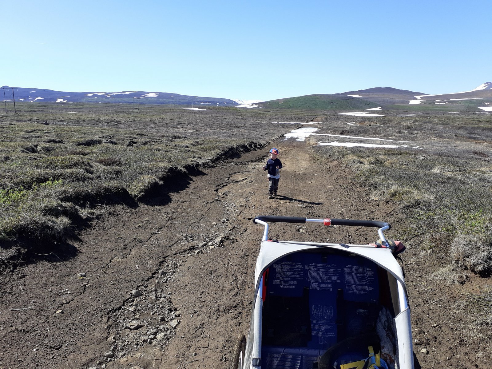 Fimmtudaginn skein enn sól en vindur var af suðri. Héldum við nú austur Reykjaheiði en síðan áfram heiðarveg til austurs. Af þessum heiðarvegi eru ótal slóðir til norðurs, hver að sínum bæ, og ekki auðvelt að átta sig á hverjum. Framan af var talsvert af sköflum þ.a. Eggert þurfti oft að fara út úr vagninum að hjálpa pabba sínum að ýta. Vorum við fyrstir þarna á ferð þetta vorið, og leiðin því ótroðin. En veður var eins best var á kosið og áfram seiluðumst við. Þarna verða hjólförin á köflum nokkuð djúp, og því reyndist oft best að vera með hjólið hægra megin í vinstra farinu, vinstra vagnhjólið vinstramegin í sama fari, en hægra vagnhjólið uppi á kilinum. Eins gaman og er að hjóla svona þétta moldarslóða vagnlaus, þá bíður það ekki upp á mikinn hraðakstur með vagninn. Eftir að hafa notið heiðarinnar lengi dags, komum við þvert á t gatnamót Tókum við þaðan slóðina norður í átt að Eyvindarholti. Sú leið nýtir að hluta gamla Bláskógarveginn, og hafði ég gælt við að halda hann síðan áfram að Undirvegg og stytta þannig leiðina í Ásbyrgi um 4 km. Ég hafði hjólað þann kafla 8 árum áður, og í minningunni, hafði sá kafli Bláskógavegar ekki verið alslæmur (þó að hann versnaði mikið þegar vestar dró), en þegar Eyvindarholtsvegurinn yfirgaf Bláskógarveginn, var ljóst að sú leið yrði ekki farin til gagns með barn í vagni. Héldum við því niður á Hringveg, komum við á Hóli, enda vatnslausir orðnir, snæddum þar nesti og héldum í Ásbyrgi þar sem við tjölduðum nálægt leikvelli, í fullmiklu skjóli en líka of miklum mývargi. Var Eggert því í skjóli í vagninum á meðan faðir hans tjaldaði.