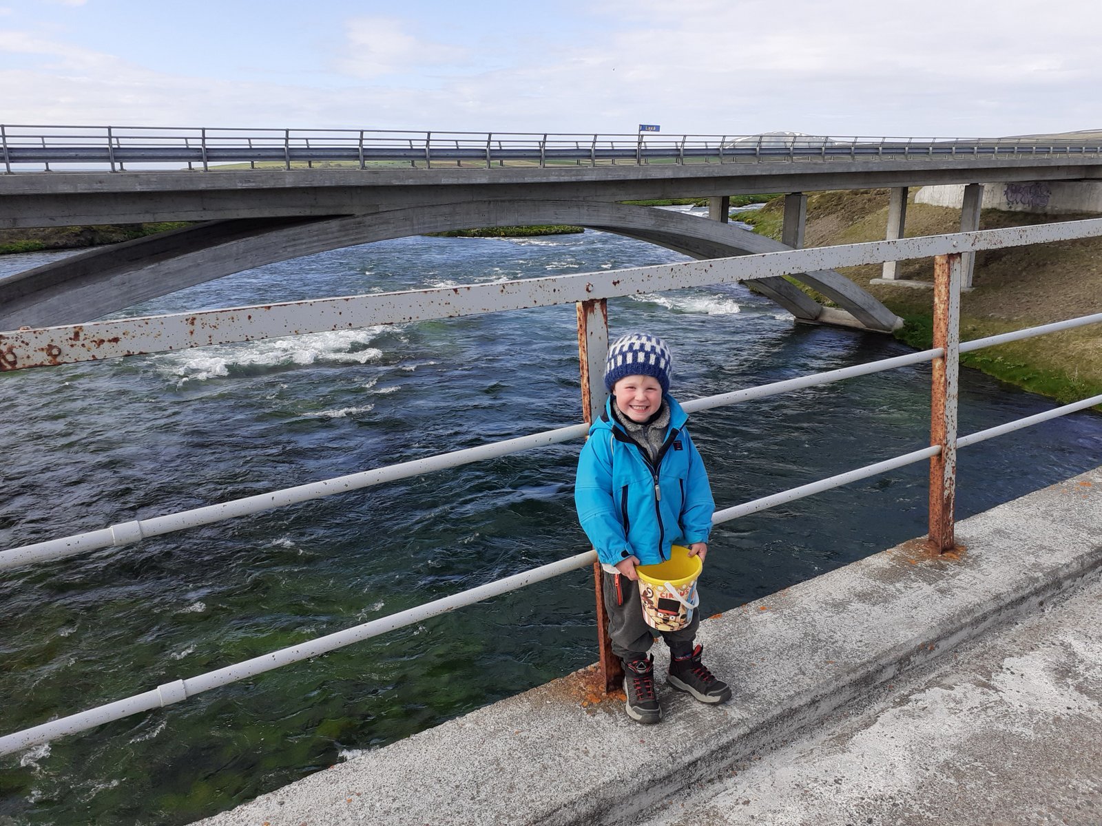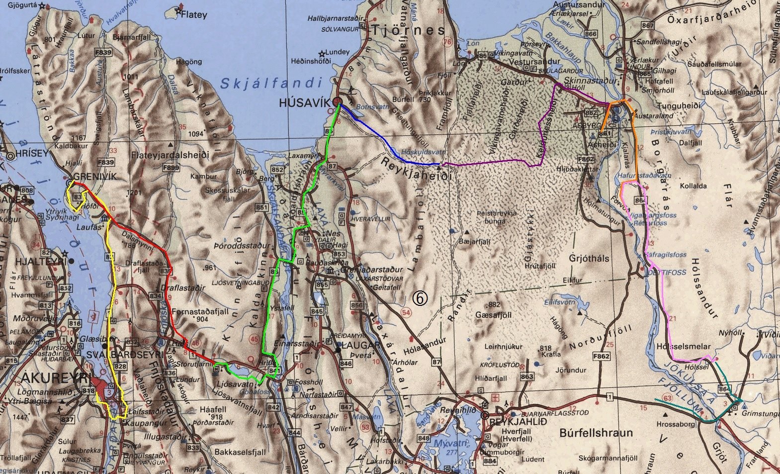 Á sunnudagsmorguninum vistuðum við okkur upp til nokkurra daga í Bónus við Miðhúsabraut og renndum okkar síðan niður brekkurnar í átt að flugvellinum. Hugmyndin var að sneiða sem mest framhjá hringveginum og ætluðum við því að fara gömlu brýrnar yfir Vaðlana og þaðan beint upp í brekkurnar í norðurátt. Kom nú í ljós að Akureyrarflugvöllur hafði nýlega verið lengdur til suðurs og við það hafði verið lokað fyrir umferð að vestustu brúnni. Hins vegar var ný brú í smíðum, að mestu tilbúinn, en þó voru tengingar við hana ófrágengnar. Ákváðum við feðgar að láta þetta ekki stöðva okkur, tókst að drösla búnaði upp á og af brú, og halda síðan áfram austur yfir Vaðlana. Beygðum síðan örstutt til suðurs inn Eyjafjarðarveginn austanverðan en síðan strax aftur til vinstri upp og norður hlíðina að Leifsstöðum, lækkuðum okkur síðan ögn niður áður en beygt var til hægri og norður veg 828 í átt að Varðgjá og honum síðan fylgt alla leið niður á hringveg, og honum fylgt í rúma 200 metra að hringtorginu við Vaðlaheiðargöngin. Héldum við síðan „gamla“ hringveginn norður í átt að Víkurskarði.