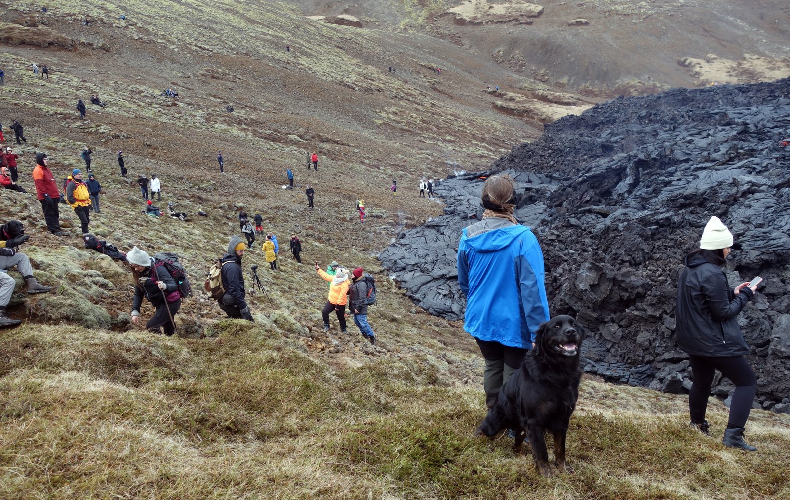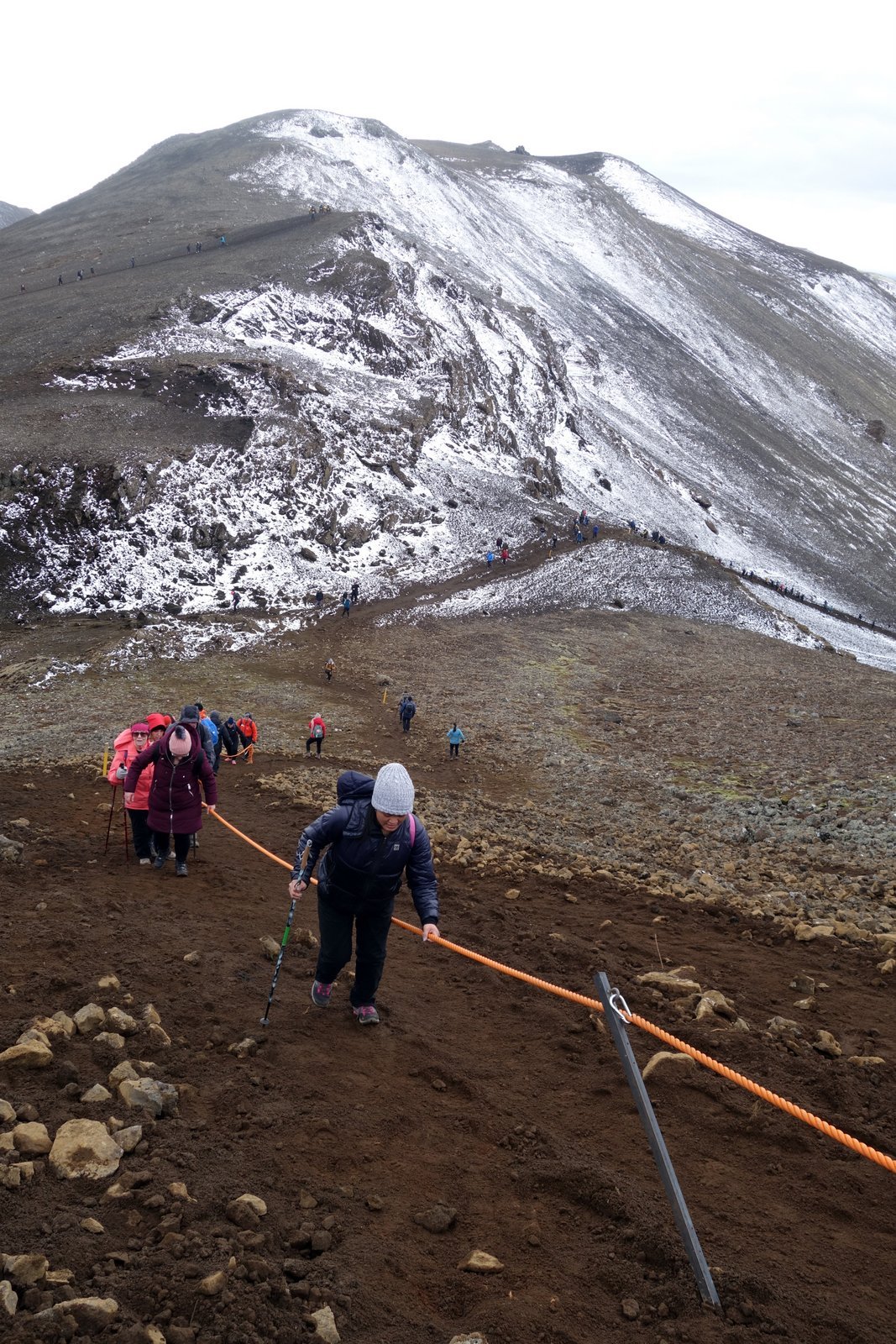 Urð og grjót, urð og grjót, ekkert nema urð og grjót. Og allt upp í mót. Nema á bakaleiðinni, þá var allt niður í mót, en ennþá urð og grjót. Sem betur fer voru Björgunarsveitirnar búnar að stika góða gönguleið inn eftir Geldingadal og koma fyrir kaðli í bröttustu brekkunni. Það auðveldaði gönguna mikið.
