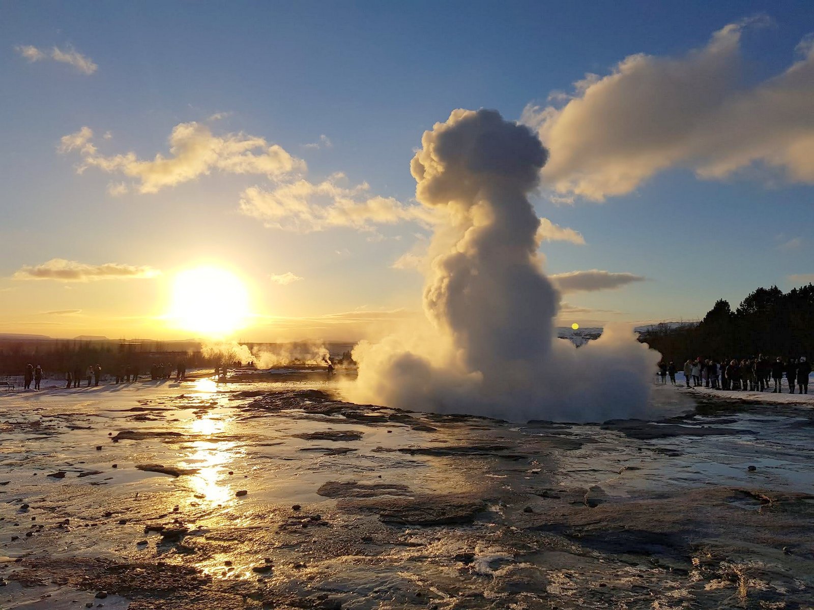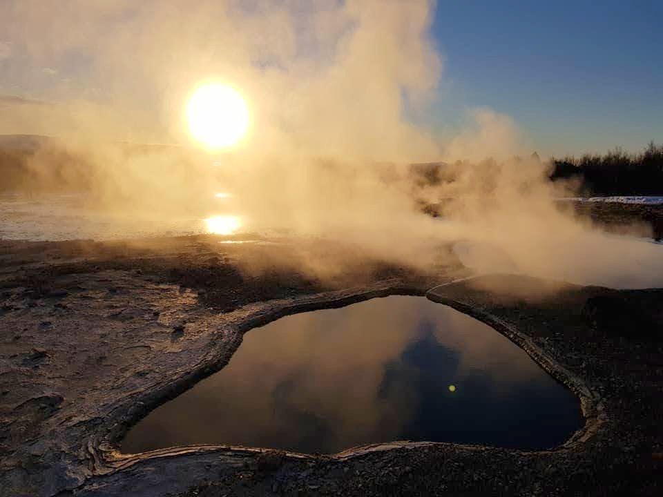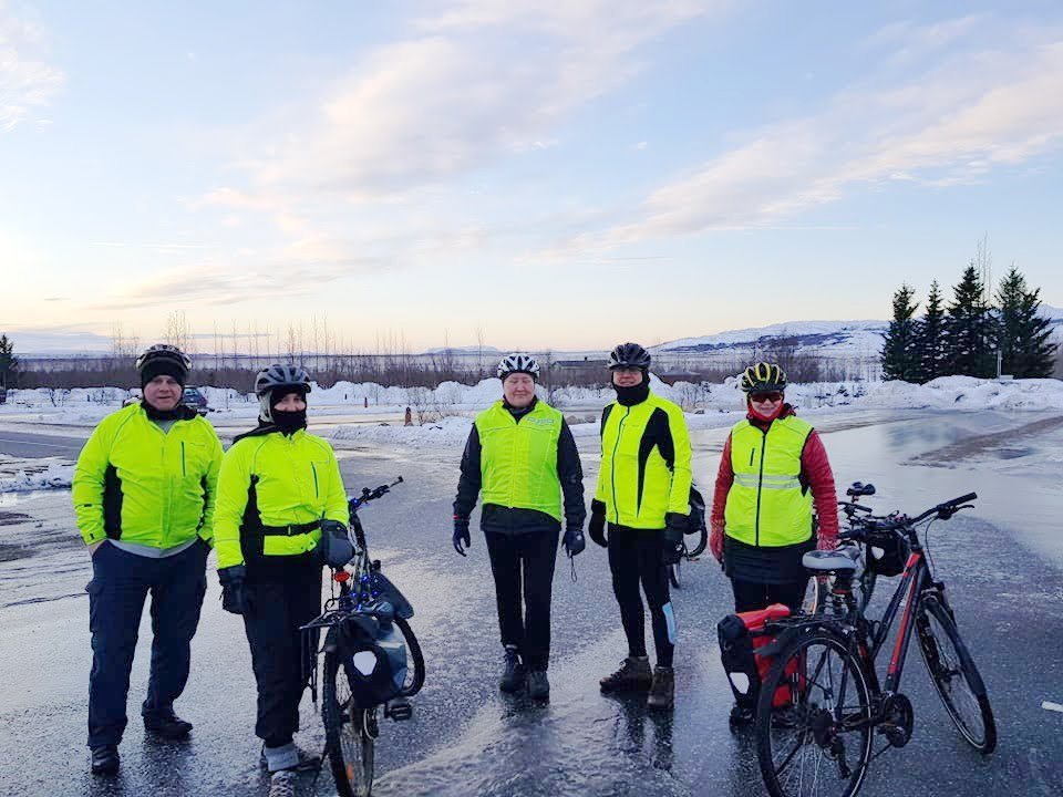 Laugardagur rann upp, bjartur og fagur. Fararstjórinn ekki göngufær en það er nú þannig með hjólreiðarnar, þær eru ívið léttari (gosh, þar fór harðjaxlalúkkið fyrir lítið) og eftir dagsferð á reiðhjóli hafði bólgan runnið að mestu úr hnénu. Plan D var nefnilega nokkurra kílómetra gönguferð. Ef það væri ófært til hjólreiða, en að vetrarlagi þarf að hafa þann varnagla í huga. Þegar við ætluðum að taka hjólin niður af bílunum kom í ljós að allir lásar voru frosnir og engin leið að opna þá. Eftir að Geysir café reddaði volgu vatni, þá tókst okkur að þýða lásana. Heitt vatn, hitabrúsi, lásasprey og plastpokar er komið á vetrar útbúnaðarlistann. Ekki tók betra við, bæði gírar og bremsur á hjólunum voru frosin. Sem betur fer var hjólaleið dagsins að mestu á jafnsléttu og því gekk að vera á hálfbremsulausu hjóli. En gírarnir eru annað mál. María þurfti að hætta við hjólaferðina, af því hjólið hennar var frosið fast í lágum gír. Elfa var ekki búin að fá hjólið sitt afhent og því fóru þær tvær í gönguferð um Geysissvæðið. Ávallt að hafa plan B, C og D þegar ferðast er að vetrarlagi. Talandi um plan B. Stundum verða óhöpp til góðs. Þegar við komum að bíl Sigga sem hafði verið skilinn eftir niðri við þjóðveg, þá kom í ljós að gluggi hafði verið skilinn eftir galopinn. Eins gott, því hurðarnar voru svo gaddfreðnar að hann varð að skríða inn um gluggann. Verst hvað hann var snöggur að því, afrekið náðist ekki á myndband.