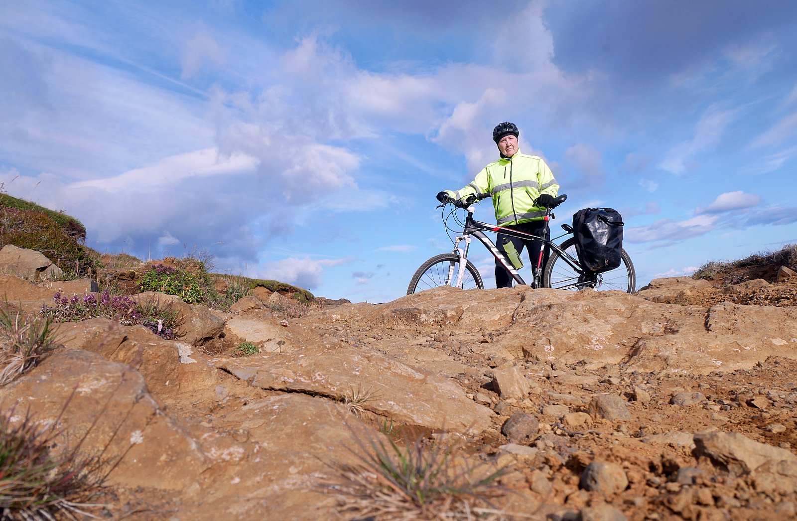Ég fór á venjulegu reiðhjóli með mjóum dekkjum. Hefði betur verið á grófari dekkjum, það var nýbúið að setja möl ofan í veginn og hún var það gróf að ég þurfti að ganga 2ja km kafla á meðan hjólarar á grófari dekkjum þeystu fram hjá mér. Svo þurfti ég að teyma hjólið upp síðustu brekkuna, ég hefði vel getað geymt það fyrir neðan hana, en hey, hluti af prógramminu var að taka töff sjálfu.
