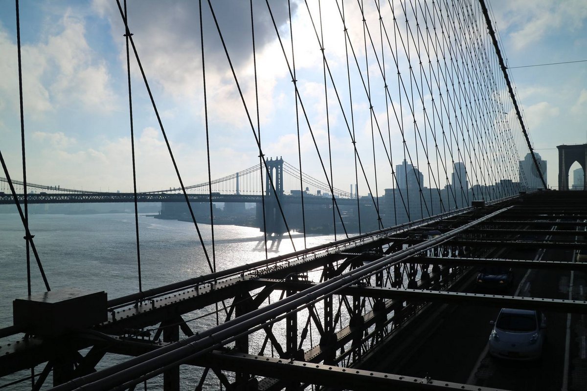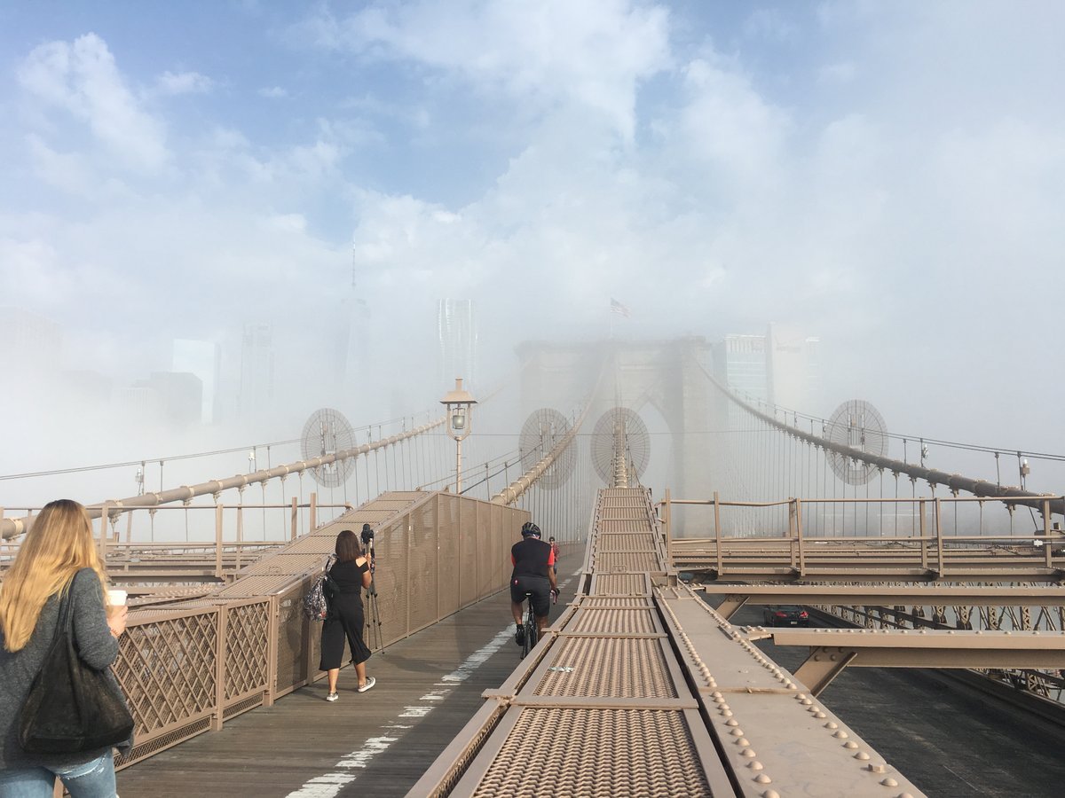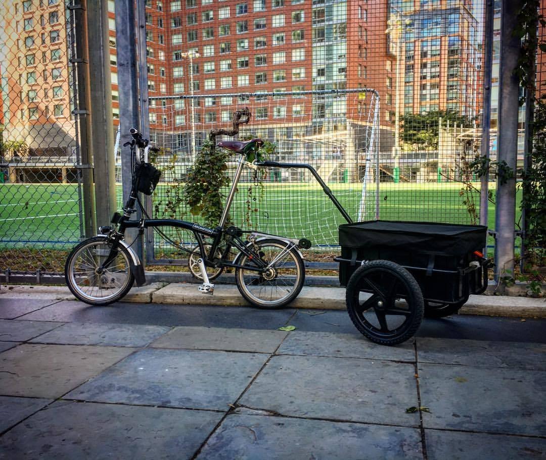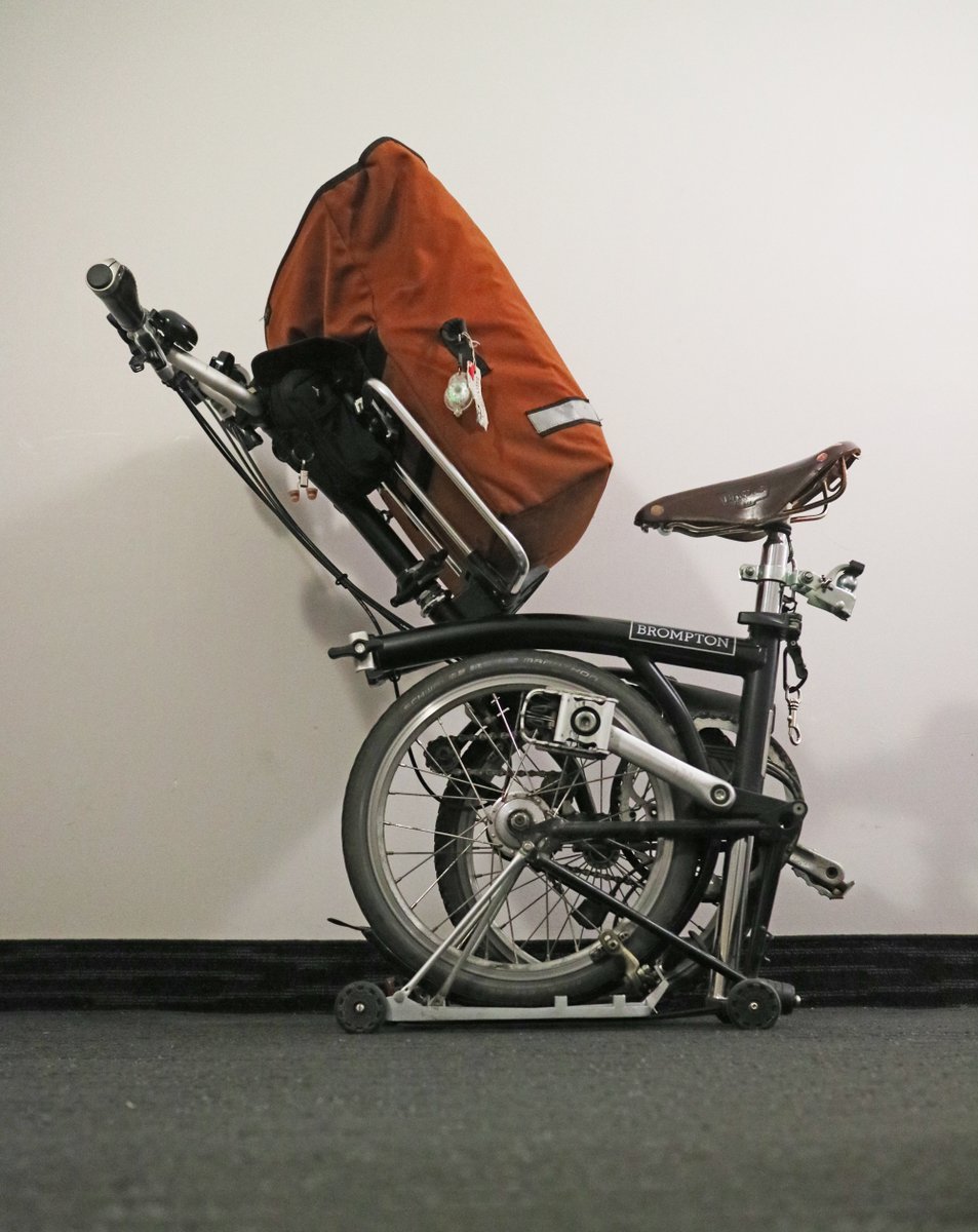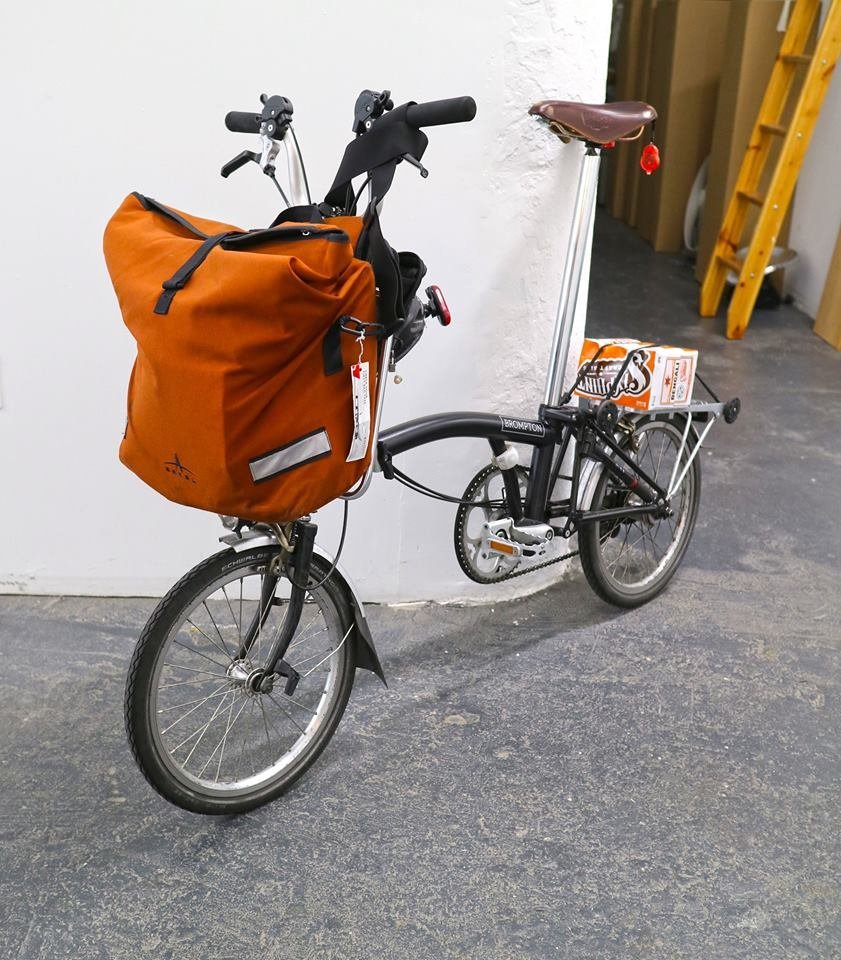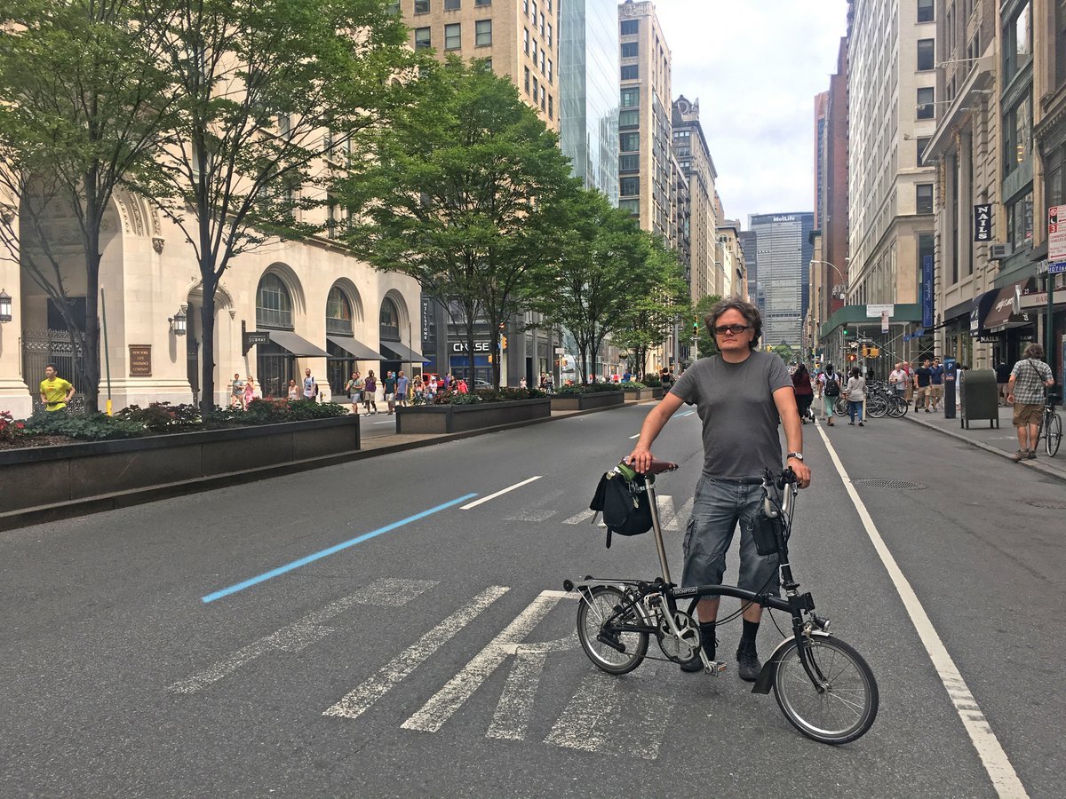 Dags daglega (ca. 20-25km) nota ég svo Bromptoní vinnuna, háþróað breskt samanbrjótanlegt hjól, sem ég smelli undir vinnuborðið í stúdíóinu. Það er hægt að brjóta saman hálfa leið og rúlla þvi inn í búðir eins og innkaupakerru. Það nota ég í öll matarinnkaup og hef líka sér tösku framan á því. Þegar heim er komið hverfur það inn í eigin skáp eða hjólskúrinn minn. Á því fer ég yfir Brooklyn eða Manhattan brýrnar og suma morgna hitti ég félaga minn Jón Emil sem kemur úr hinni áttinni og þá er high-five á miðri brú.