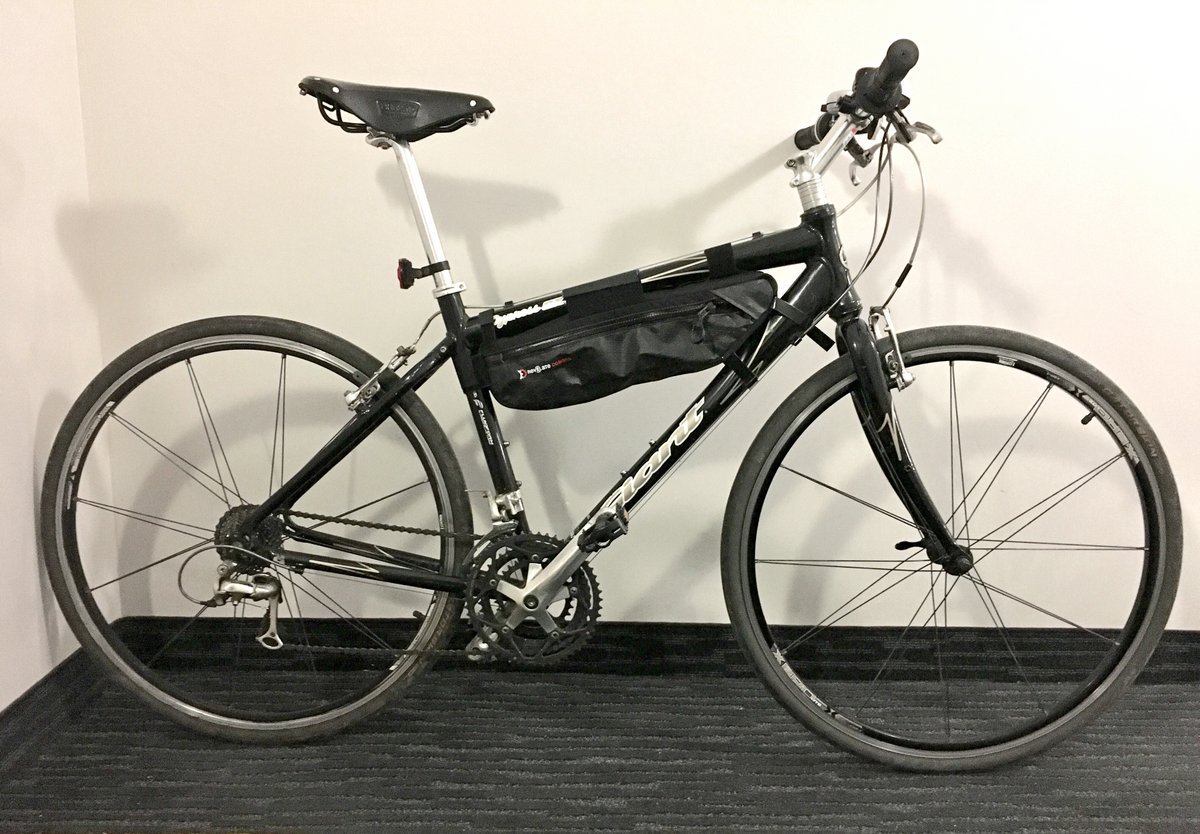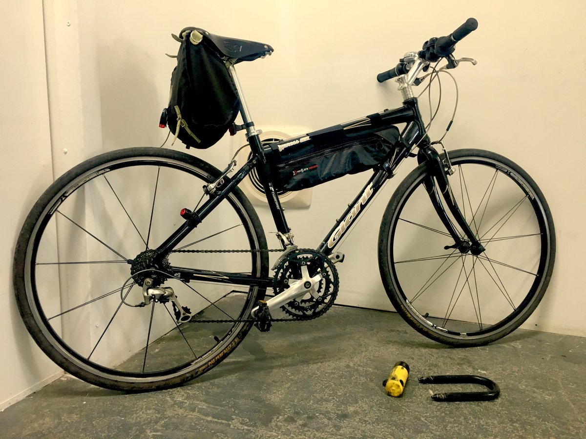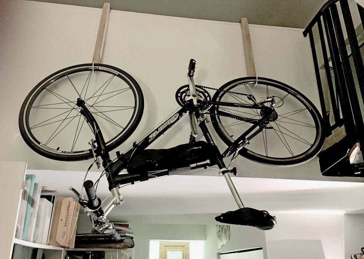 Annað hjólið er ósköp venjulegt 15 ára gamalt Giant 700 hybrid sem ég fer á í lengri ferðir (40-100 km), til að fara hraðar yfir og reyna meira á mig. Hef farið lengst 180 km leið á því í einum rykk en það er sem sagt svona skemmti-/æfingahjól í aukatíma. Ég hef sem minnst aukadót á því til að halda því í svona 11 kg, þar sem ég hengi það upp yfir haushæð og þarf því að geta lyft því með góðu móti (mynd). Maður hefur auðvitað engann bílskúrsaðgang í borginni (og engann áhuga á að eiga bíl) og þarf því að koma þessum hlutum fyrir inni hjá sér svo allir séu sáttir.