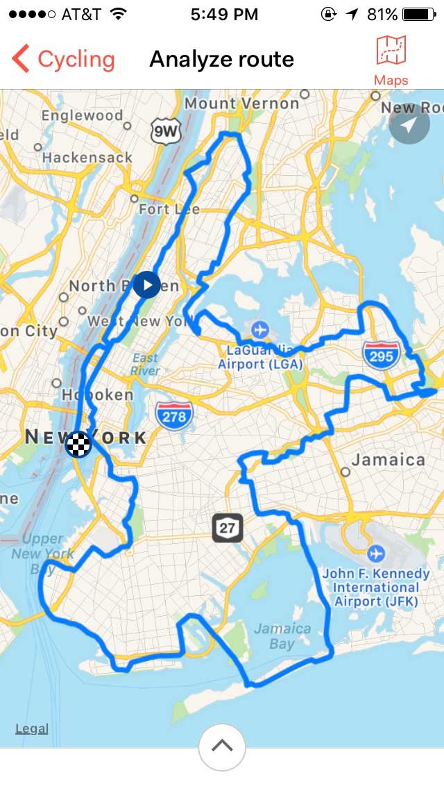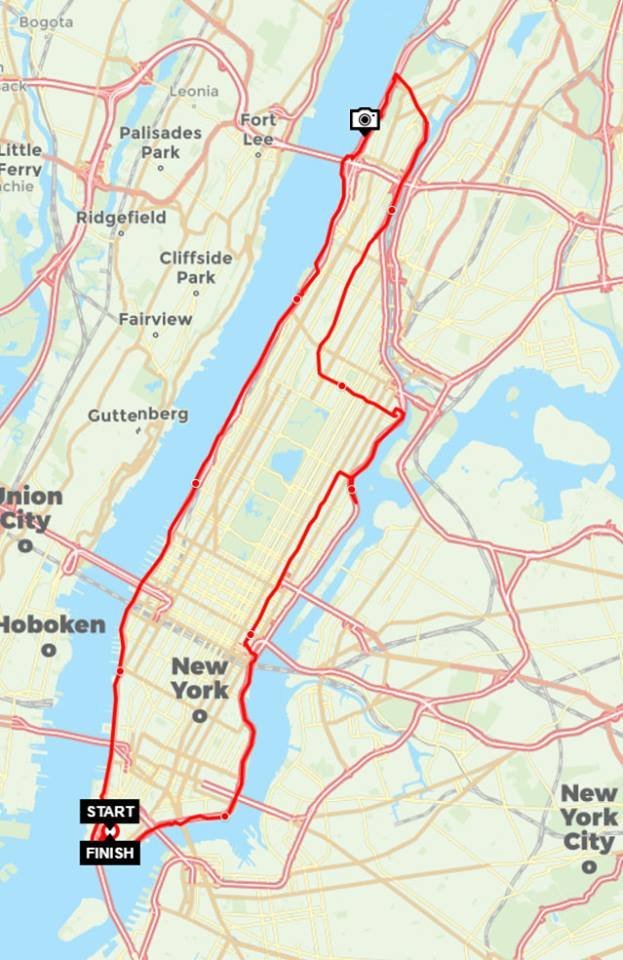 Dags daglega er geysimikill fjölbreytileiki í hjólaumhverfi borgarinnar. Fyrir utan að hjóla bara í vinnuna er hægt að hjóla langt á tiltölulega flötum leiðum, en svo eru líka leiðir með ágætum brekkum eins og til að mynda stóru brýrnar, sem eru mjög skemmtilegar. Þær eru svona tveir til þrír km á lengd hver um sig. Þar sem ég þekki borgina eins og handarbakið vel ég leiðirnar mínar oftast fyrirfram, t.d.hjóla meðfram Hudson ánni frá fjármálahverfinu/Wall Street að George Washington brúnni (15km löng leið) á mjög góðum hjólastíg sem gerður var milli 1990-2000. Þá finnst mér skemmtilegt að taka hring í kringum Manhattan (50km) en það er á köflum á umferðargötum (MYND) og ekki alls staðar hjólastígar. Oft bæti ég við aukadúrum, s.s. hinni eða þessari brú eða tek tvo hringi í Central Park í og með, kannski uppí 100km leið.