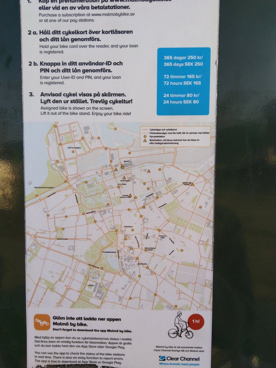 Eftir ráðstefnu sem ég sótti í borginni hafði ég nokkra tíma lausa og ákvað að skella mér á borgarhjól að skoða borgina. Borgarhjól eru hjól í stöndum um borgina sem hægt er taka á skammtímaleigu með lítilli fyrirhöfn. Greiðslufyrirkomulag er gjarnan með appi tengt greiðslukorti og maður skráir sig í mislanga áskrift. Í Malmö notar maður appið “Malmö by bike” [www.malmobybike.se/en] sem fæst í Google play store eða Apple Appstore. Áskriftarmöguleikar eru þrennskonar, 365 dagar, 72 tímar og 24 tímar og kostar það 250, 165 og 80 sænskar krónur. Eftir að hafa skráð sig er manni ekkert að vanbúnaði að taka hjól í næsta standi með notendanúmeri og pin númeri að vopni en heimamaðurinn getur sótt sér sérstakt kort til þess arna. Hægt er að nota hjólið í eina klukkustund í senn. Þegar sá tími er að renna út skilar maður hjólinu í næsta stand og tekur annað hjól í staðinn ef maður ætlar að halda áfram. Hjólin voru ágætlega útbúin með 7 nafgírum, nafrafal sem knýr fram og afturljós og handbremsum.