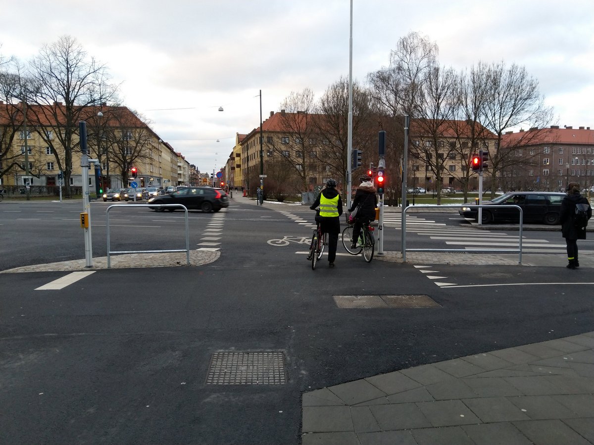 - Tvístefnustígur þverar jaðar markaðstorgsins Möllevångstorget. Borgarhjólastandur milli stígs og götu.