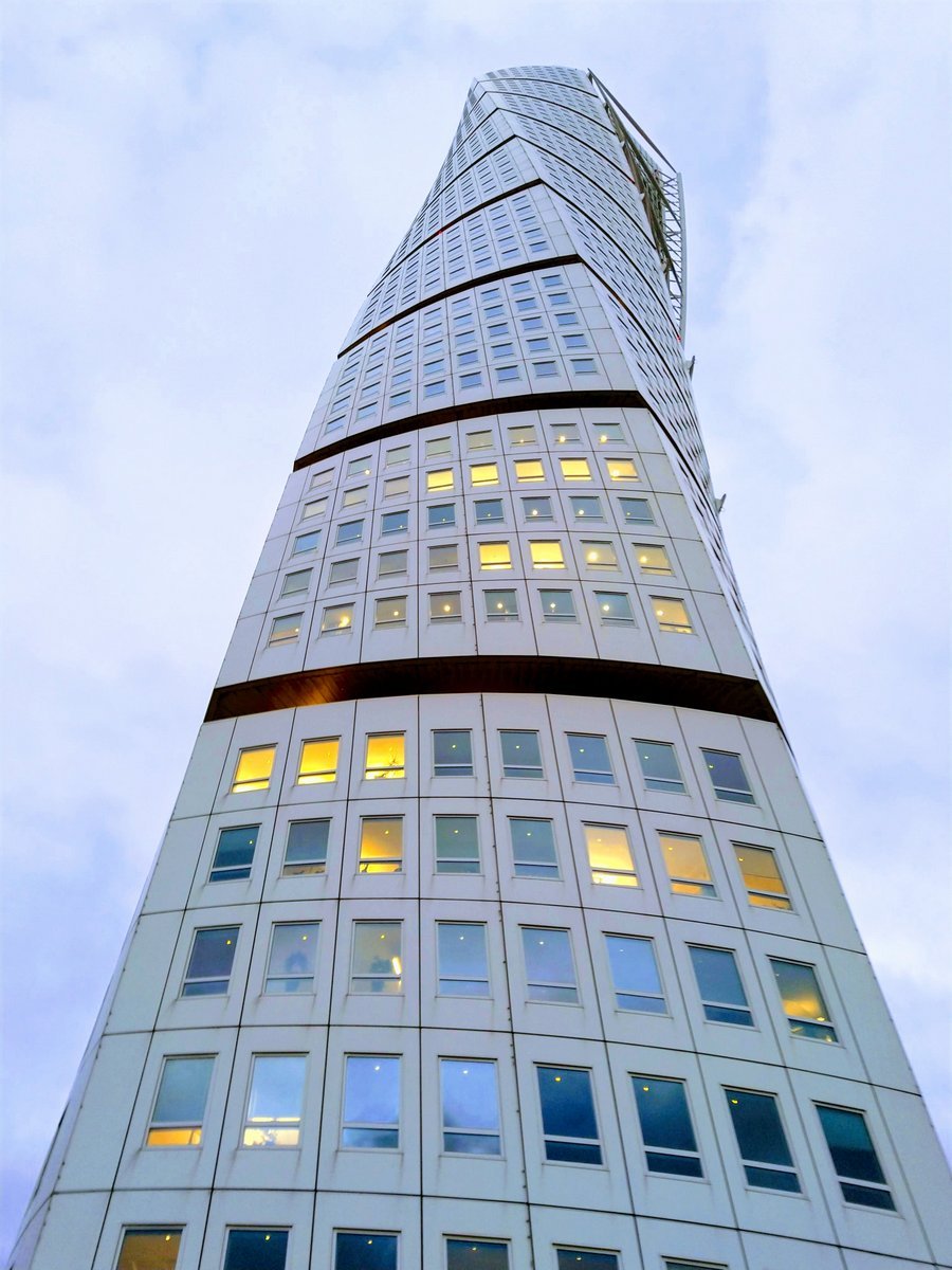 Ég hjólaði frá lestarstöðinni um 14 km hring en náði auðvitað ekki að sjá hana alla á tveimur tímum. Ég fór fyrst í suður í gegnum miðborgina og allt að Rosengård hverfinu sem er blokkahverfi með háu hlutfalli innflytjenda. Þar stóðu yfir framkvæmdir við nýja brautarstöð fyrir pendeltåg eins og úthverfalestir þeirra Svía heita. Þaðan lá leiðin í vestur framhjá lestarsstöðinni Triangeln þar sem m.a. mátti sjá hjólastæði og í gegnum garðinn Slottsparken með Malmö kastala að ströndinni þar sem brúin yfir Eyrarsund blasti við í fjarska. Þar utan við liggur hverfið Västra hamnen sem er frægt þróunarsvæði með íbúða- og athafnahúsnæði sem hefur verið byggt upp á s.l. 20 árum á gömlu iðnaðarsvæði við ströndina þar sem m.a. skipasmíðastöðin Kockums stóð áður. Ég fór um þetta hverfi í ljósaskiptunum og leist frekar vel á. Það er byggt þétt með fjölbreyttum húsum og virðist vinalegt við fyrstu sýn. Frægasta byggingin þar er “Turning Torso”, um 190 m há bygging með skrifstofum á fyrstu 12 hæðunum, íbúðum á 13.-52. hæð og ráðstefnu sölum á 53. og 54. hæð. Byggingin hverfist um 90° frá grunni að efstu hæð. Þetta er líka hæsta byggingin en flest húsin eru 3-5 hæðir.