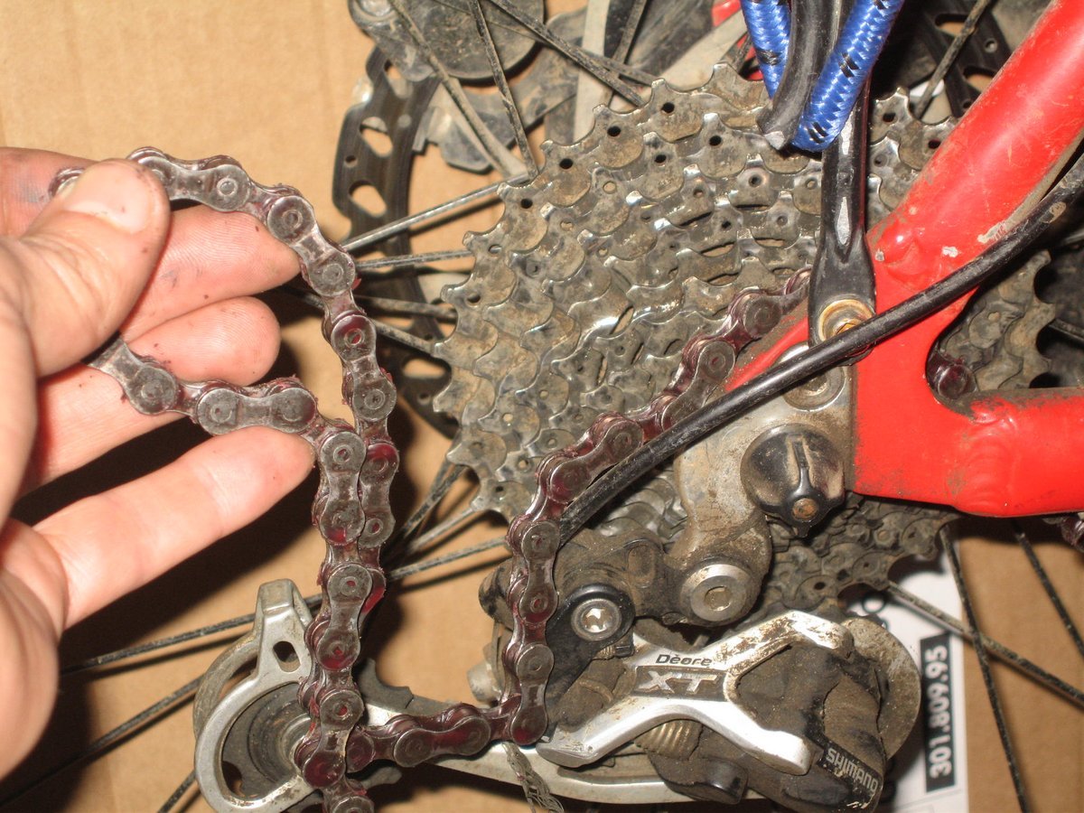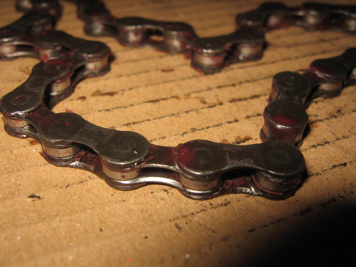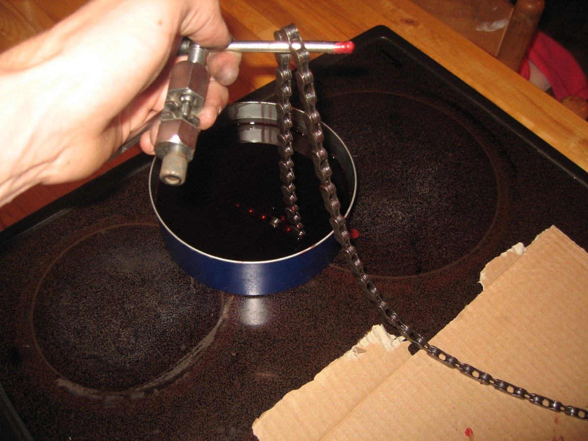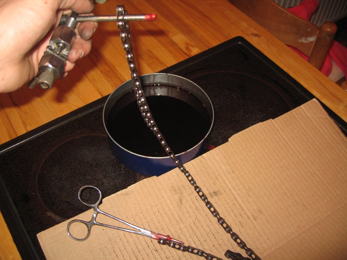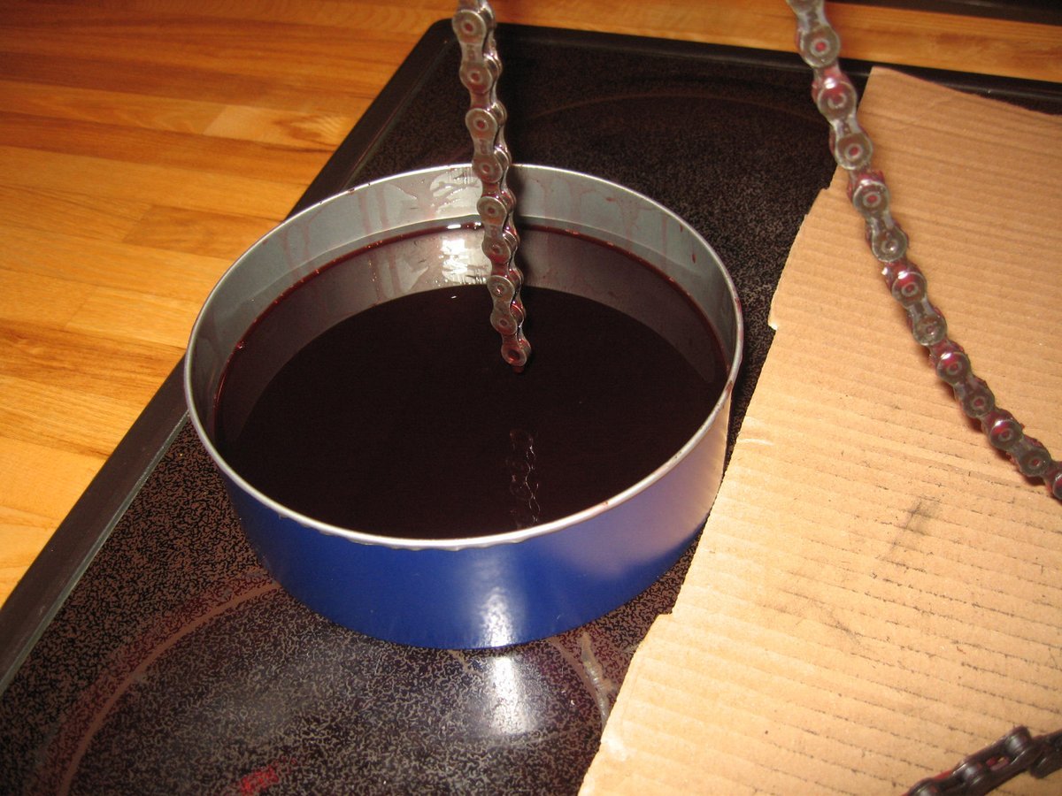 Fyrir nokkru gerði ég tilraun með að nota kertavax til að verja keðjuna. Það kom á óvart hvað það virist virka vel og lengi en brasið, subbuskapurinn og vinnan við það fær mann til að efast um hvort það borgi sig. En svona fór ég að: ég tók útikerti þar sem mér fannst vaxið í þeim feitara. Það var í hentugri málmdós sem ég setti einfaldlega á eldavélarhellu á lágan hita í smá stund. Þegar allt vaxið var bráðið veiddi ég kveikinn uppúr og setti keðjuna hreina, þurra og upprúllaða varlega ofaní. Í smá stund á eftir komu litrar loftbólur út úr hlekkjunum. Þegar þær hættu að koma notaði ég vír til að veiða keðjuendann uppúr og lét hanga yfir pottinum til að það mesta gæti lekið af keðjunni. Svo þegar hún kólnaði var hún stíf eins og prik og ég fór að efast um að þetta væri sniðugt. Með smá brasi og ofbeldi þræddi ég stífa keðjuna upp í gegnum skiptinn og á sinn stað, setti keðjulásinn saman og snéri. Þetta var stíft í kannski 5 hringi og varð þá ljúft og liðugt á ný. Með þetta svona hjólaði ég nokkur hundruð kílómetra í snjó og saltslabbi á eftir án þess að gera nokkuð. Svo smurði ég seint og síðarmeir með keðjuolíu þegar kom smá ískur. Mér fannst líða lengur á milli þess sem ég smurði fyrst á eftir og er það kenning mín að vaxið haldi olíunni betur inni í keðjunni og óhreinindunum úti. Ég verð þó að vara við að það er varasamt að bræða vax á þennan hátt og auðvelt að brenna sig. Keðjan verður líka að vera þurr og hrein til að minnka líkur á vatns-sprengingu ofaní vaxinu sem getur skvettst yfir mann. Þessi tilraun var ekki vísindaleg og engar mælingar né skráningar gerðar um smurningar eða tegundir olía á eftir enda einungis til gamans gert. Ég veit ekki hvort ég mæli með þessu fyrir hvern sem er, en ég á eftir að gera þetta aftur í vetur til að verja mína keðju. Einfaldast er að smyrja oft og reglulega með þunnri keðjuolíu helst með tefloni í sem freyðir.