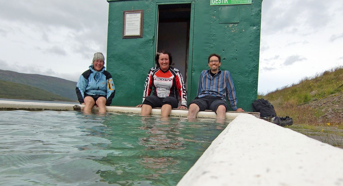 Eftir hjólaferð laugardagsins munum við skola af okkur ferðarykið í heitum laugum í Heydal. Snæðum saman á veitingastaðnum og svo er gist í sumarbústað næstu nótt. Hafragrautur með kanelsykri, rúsínum og mjólkurdreitli í boði.