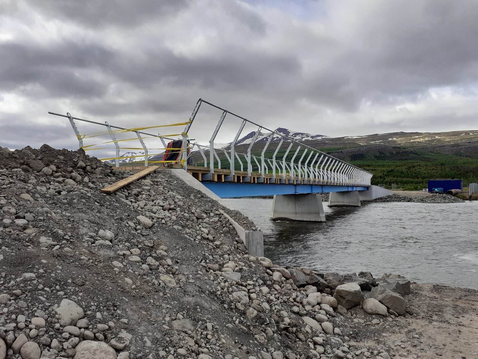 Á sunnudagsmorguninum vistuðum við okkur upp til nokkurra daga í Bónus við Miðhúsabraut og renndum okkar síðan niður brekkurnar í átt að flugvellinum. Hugmyndin var að sneiða sem mest framhjá hringveginum og ætluðum við því að fara gömlu brýrnar yfir Vaðlana og þaðan beint upp í brekkurnar í norðurátt. Kom nú í ljós að Akureyrarflugvöllur hafði nýlega verið lengdur til suðurs og við það hafði verið lokað fyrir umferð að vestustu brúnni. Hins vegar var ný brú í smíðum, að mestu tilbúinn, en þó voru tengingar við hana ófrágengnar. Ákváðum við feðgar að láta þetta ekki stöðva okkur, tókst að drösla búnaði upp á og af brú, og halda síðan áfram austur yfir Vaðlana. Beygðum síðan örstutt til suðurs inn Eyjafjarðarveginn austanverðan en síðan strax aftur til vinstri upp og norður hlíðina að Leifsstöðum, lækkuðum okkur síðan ögn niður áður en beygt var til hægri og norður veg 828 í átt að Varðgjá og honum síðan fylgt alla leið niður á hringveg, og honum fylgt í rúma 200 metra að hringtorginu við Vaðlaheiðargöngin. Héldum við síðan „gamla“ hringveginn norður í átt að Víkurskarði.