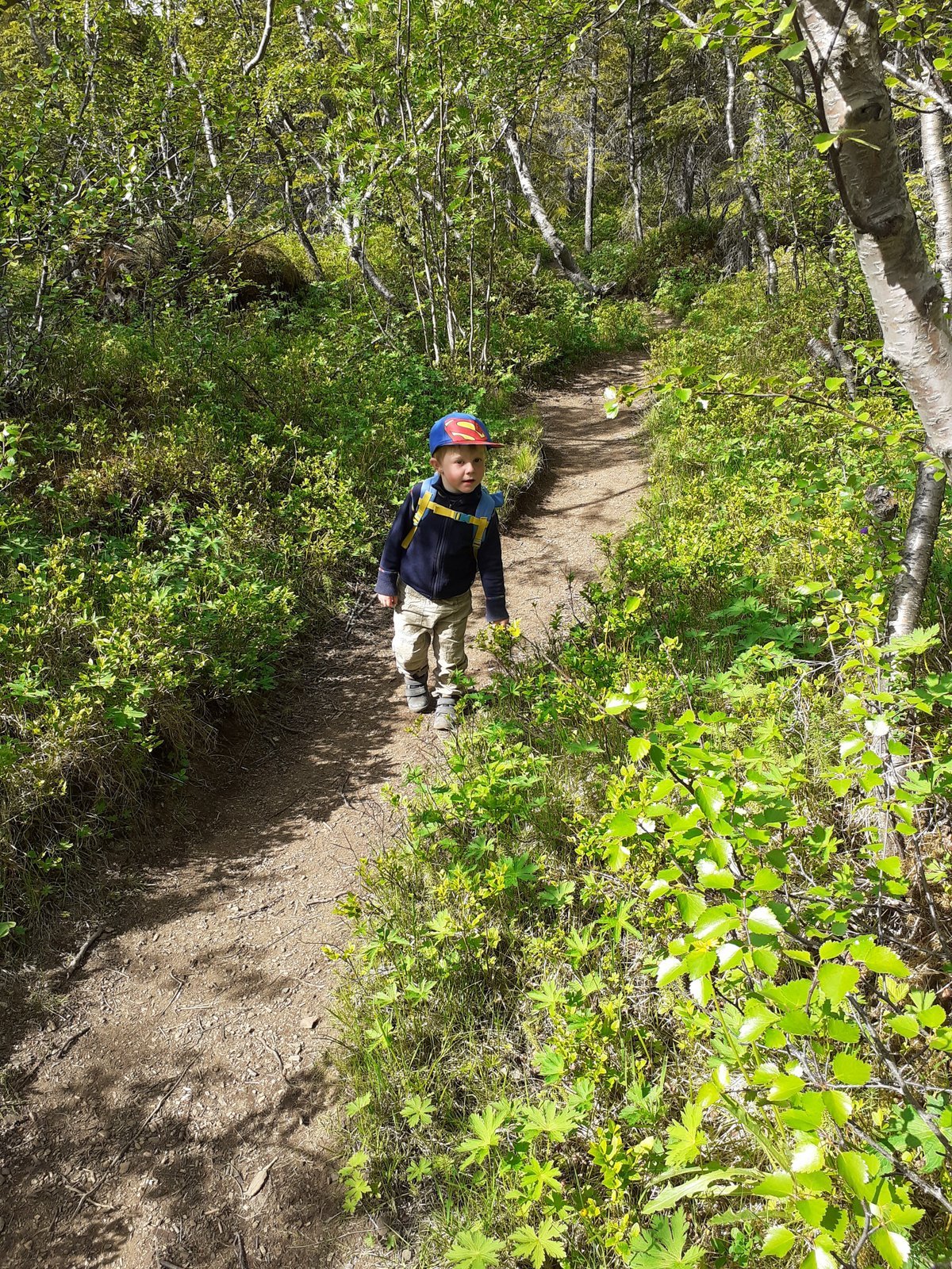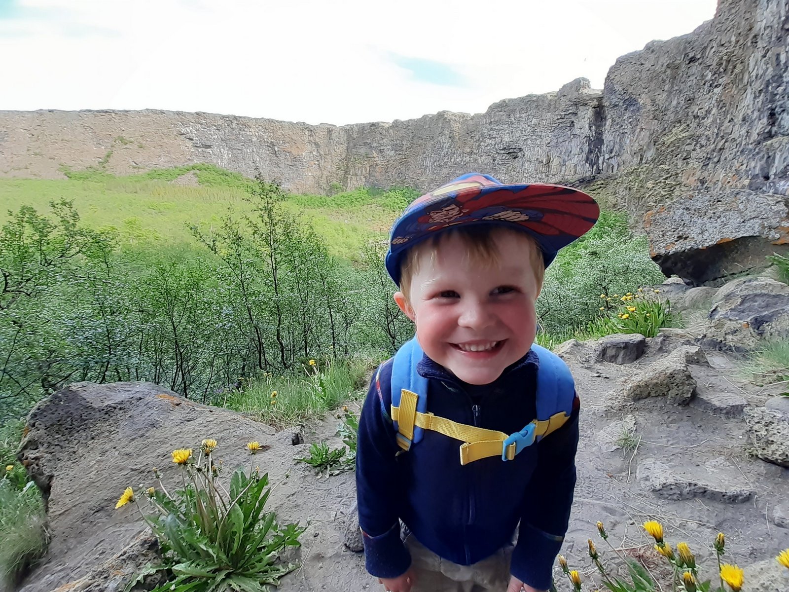 Föstudaginn tókum við rólega. Upphaflegt plan hafði verið að fara í Vesturdal og tjalda þar og skoða Hljóðakletta, halda síðan áfram niður á þjóðveg, mögulega með viðkomu við Eilífsvötn; en í ljós kom að í gangi var vegavinna á Dettifossvegi vestari (sem er hundleiðinlegt á hjóli og enn leiðinlegra með vagn) og tjaldstæðið ekki opið (sem við hefðum svo sem ekki sett fyrir okkur). Gönguleiðin í Vesturdal er ekki heppileg fyrir vagn, þó svo hún sé fín til hjólunar. Réðum við því ráðum okkar á meðan við snæddum í Ásbyrgisbúðinni og vistuðum okkur upp, kíktum á gestastofuna, lékum okkur á leikvellinum, kíktum á Botnstjörn, endur og skóginn. Upp úr kl. 19 var komið nýtt plan, við lögðum af stað, héldum eftir þjóðvegi austur yfir Jökulsá og fórum síðan lokaðan eystri Dettifossveg til suðurs. Spáð var stífri sunnanátt daginn eftir þ.a. við vildum nýta hafgolu til að koma okkur aðeins suður á bóginn. Eftir ca. 12 km á Dettifossvegi beygðum við til vesturs að Hafursstöðum og síðan áfram vegslóða áleiðis að Forvöðum. Tjölduðum svo í litlu rjóðri um hálfum km áður en komið væri að Vígabjargi. Um kvöldið gengum við á Vígabjarg, litum á Grettisbælið og skoðuðum okkur um. Forvöð er einn af mínum allra uppháhaldsstöðum, lítil töfraveröld sem svo fáir heimsækja. Við höfðum staðinn algjörlega út af fyrir okkur.