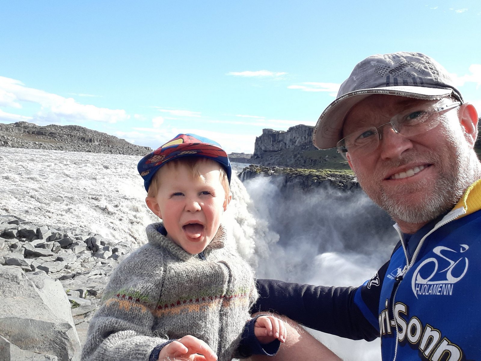 Á sunnudag var komin stíf austanátt. Við ætluðum að taka Strætó við hringveg síðdegis, en leið okkar lá í SSA til að byrja með, og því engin hraðakstur í upphafi. Við vorum orðnir matarlitlir, vegna mikillar orkueyðslu gærdagsins og því hafði ég mikinn hug á að komast í mat á Grímsstöðum. Þar var hins vegar allt lokað þegar við komum, en eldri hjón sem voru þarna á bíl stoppuðu okkur til að láta okkur vita af því. Þetta voru ábúendur, og voru á leið á Nýja hól að huga að þrílembu sem var með meidd lömb. Þar sem ég hafði aldrei komið að Nýja hóli og jafnframt velliðtækur smalamaður, varð úr að við feðgar skelltum okkur með gegn því að fá hádegismat heima hjá þeim á eftir. Þegar til átti að taka reyndist eitt lambið dáið, en hin í þokkalegu standi þ.a. ekki þurfti að taka ána heim. Héldum við því aftur í Grímsstaði þar sem við snæddum lambalæri og gæsaregg. Héldum við síðan niður á Þjóðveg og var þá enn eftir tæp klst. í strætó. Þar sem austanáttin var stíf, stóðumst við því ekki mátið að þeysa í vestur. Þó að rúmlega 30 km hraði á malbiki sé ekki mikið, þá á fjallahjóli með farangur og barn í vagni, er það nokkuð vel af sér vikið, og fimmfaldur meðalhraði stórs hluta gærdagsins. Fórum við nú á örskotastundu 12 km að nýja Dettifossafleggjaranum, tókum þar í sundur hjól, vagn og farangur og biðum strætós. Við tók 9 tíma ferðlag með rútum niður í Mjódd. 340 km á 8 dögum, þar af a.m.k. 2/3 nýhjólaðir, mestmegnis sól, þ.a. sólarvörnin kláraðist, en rigning eina nótt og einn fyrrihluta. Þetta var jafnframt lengsta innanlandshjólreiðaferðalag okkar feðga saman.