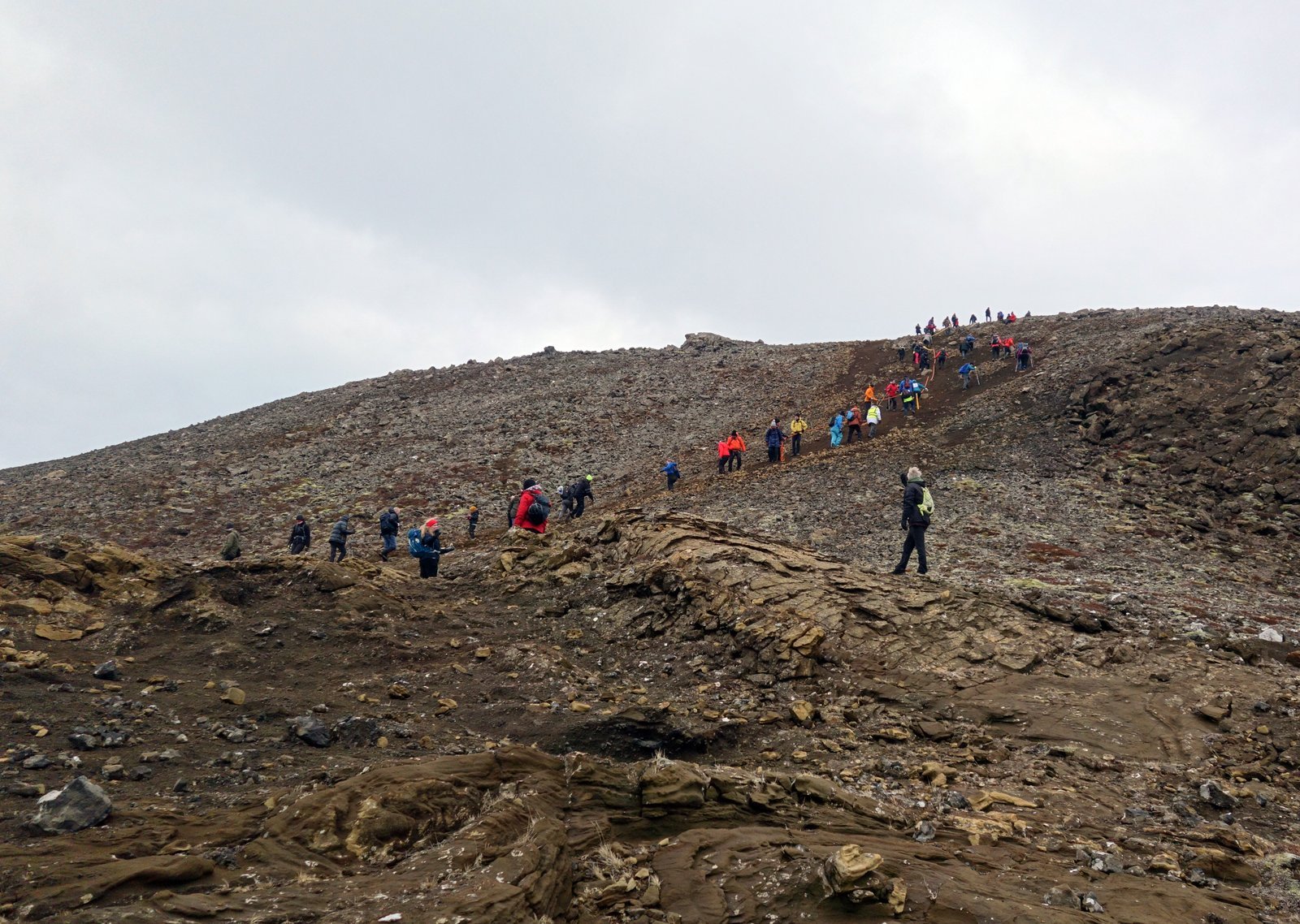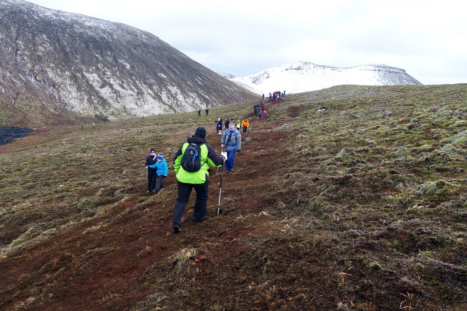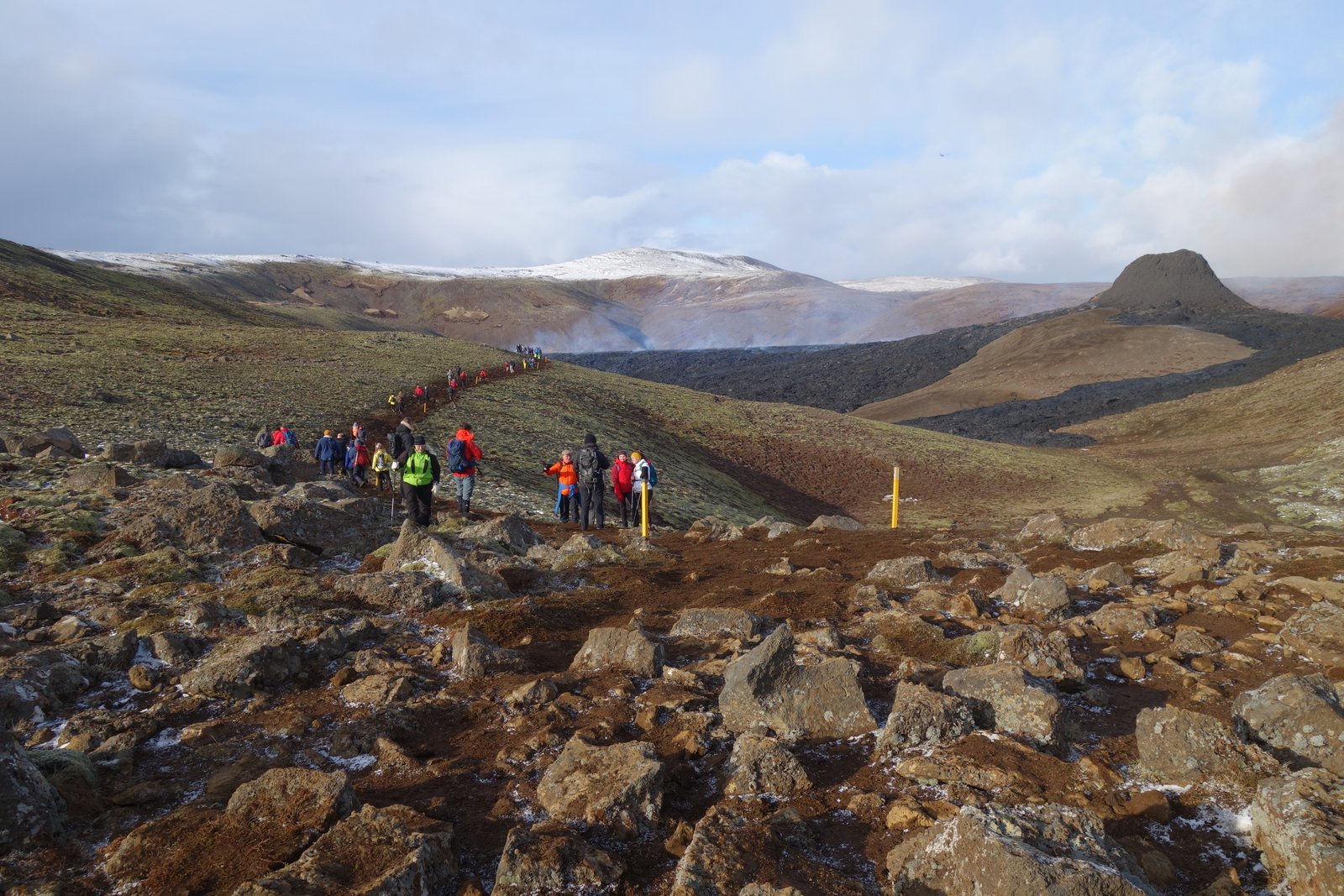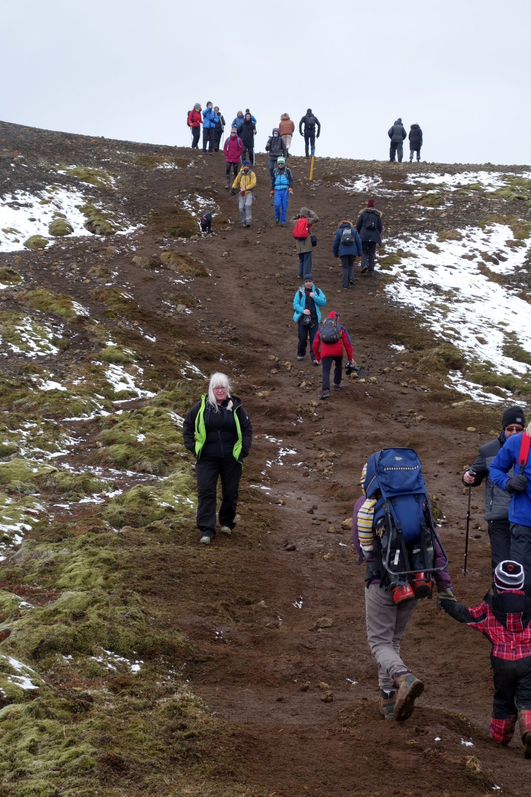 Urð og grjót, urð og grjót, ekkert nema urð og grjót. Og allt upp í mót. Nema á bakaleiðinni, þá var allt niður í mót, en ennþá urð og grjót. Sem betur fer voru Björgunarsveitirnar búnar að stika góða gönguleið inn eftir Geldingadal og koma fyrir kaðli í bröttustu brekkunni. Það auðveldaði gönguna mikið.