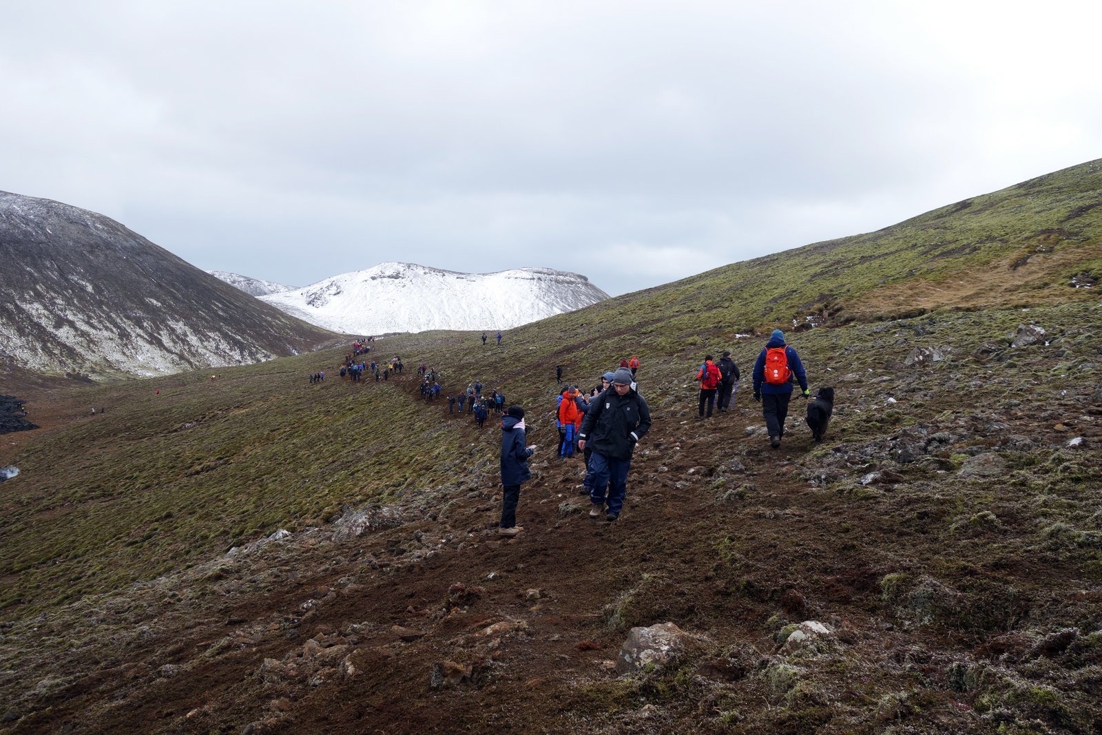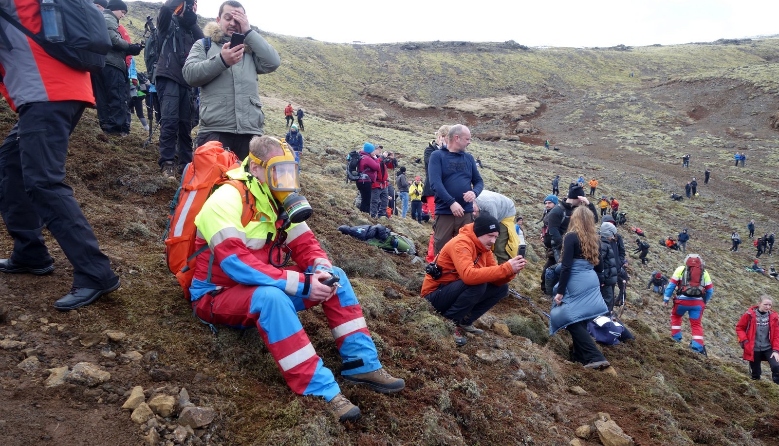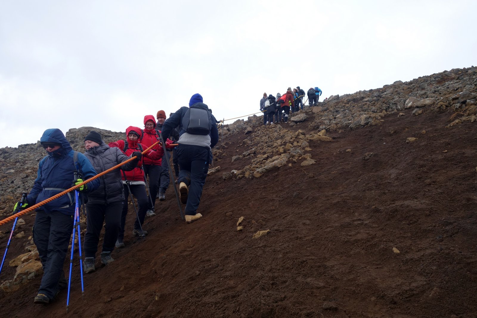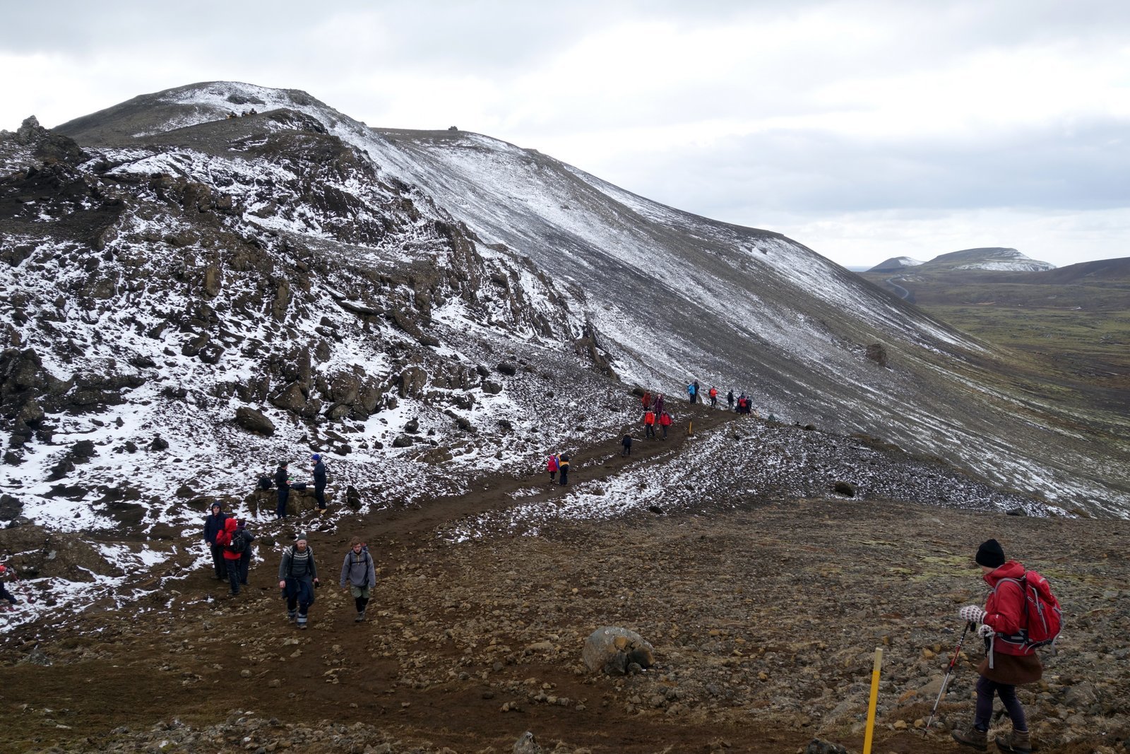 Urð og grjót, urð og grjót, ekkert nema urð og grjót. Og allt upp í mót. Nema á bakaleiðinni, þá var allt niður í mót, en ennþá urð og grjót. Sem betur fer voru Björgunarsveitirnar búnar að stika góða gönguleið inn eftir Geldingadal og koma fyrir kaðli í bröttustu brekkunni. Það auðveldaði gönguna mikið.