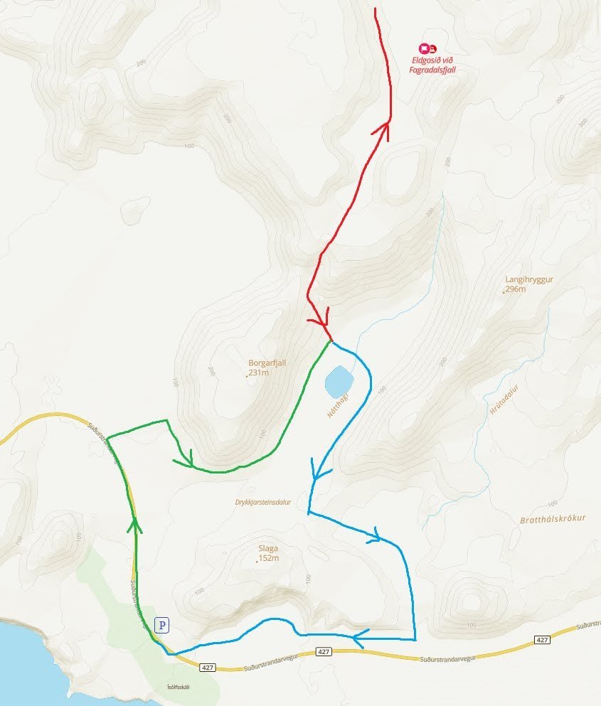 Að bíða ekki eftir fararstjóranum. Ég ætlaði að byrja á slóðunum, en félagar mínir voru svo ákafir, að þau lögðu af stað upp Ísólfsskálabrekku og ég náði þeim ekki fyrr en þar sem stikaða gönguleiðin byrjar. Svo við fórum hana, ca. 400 metra yfir hraunið. Þá vorum við komin á sæmilegan slóða sem lá meðfram fjallinu til hægri, alveg inn í Nátthaga, en þar hófst gönguferðin.