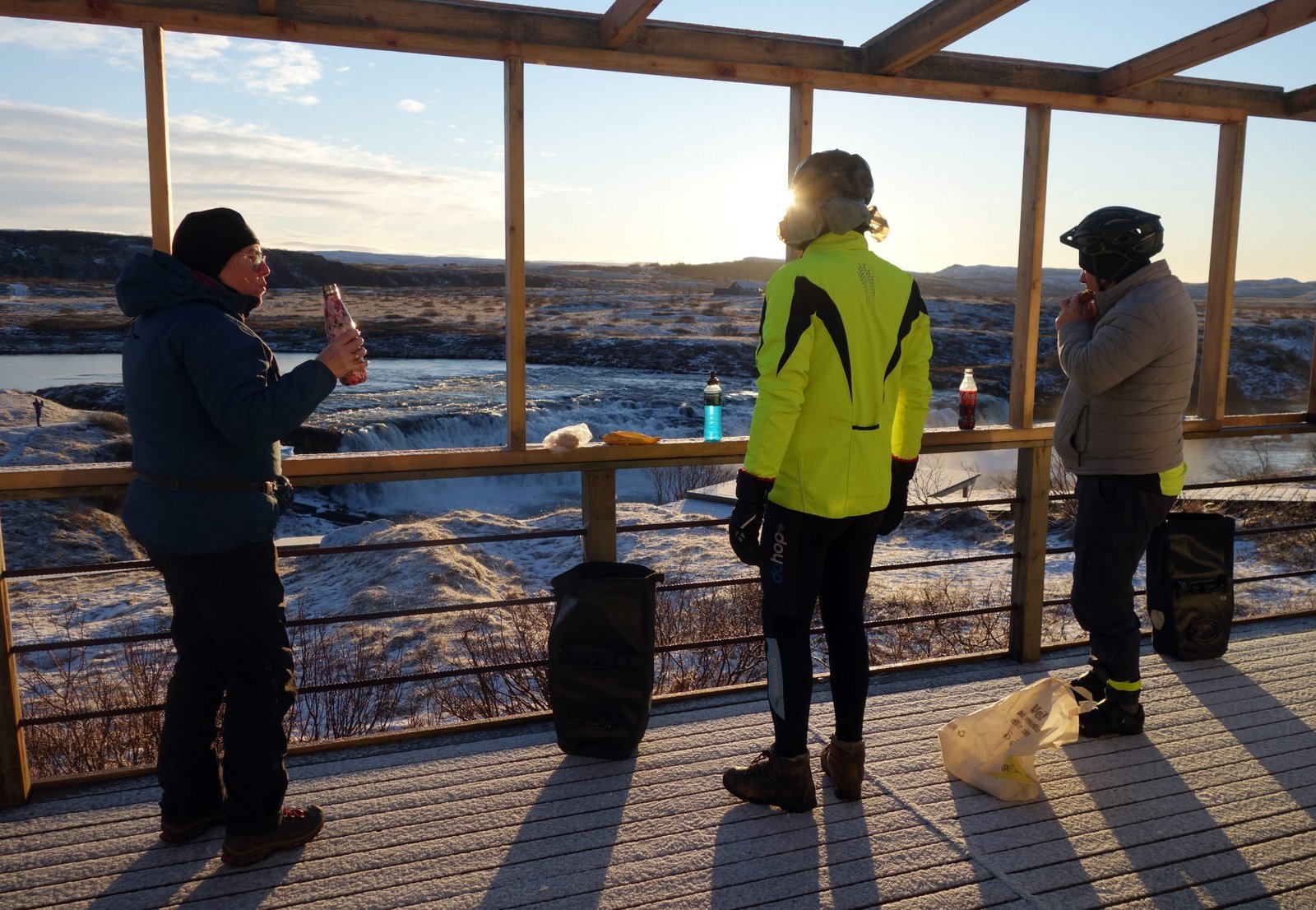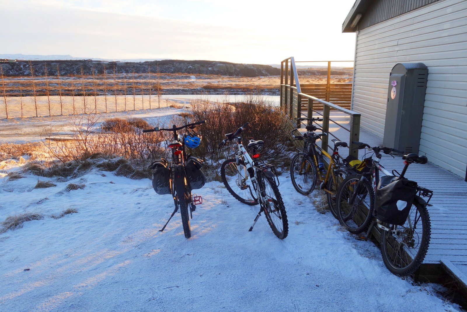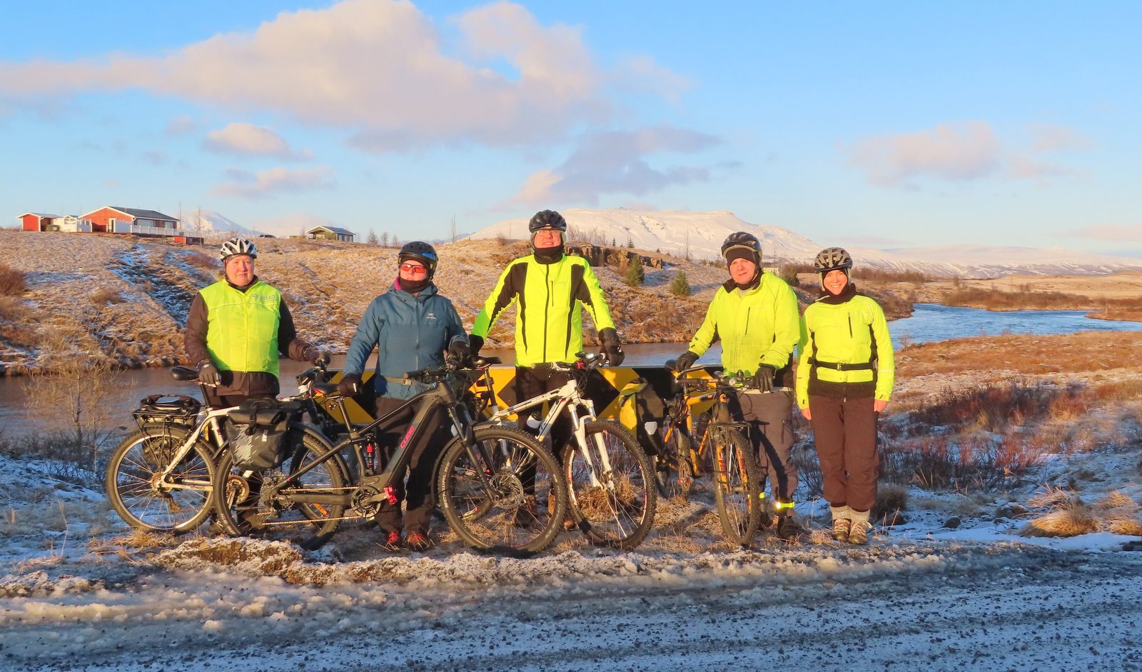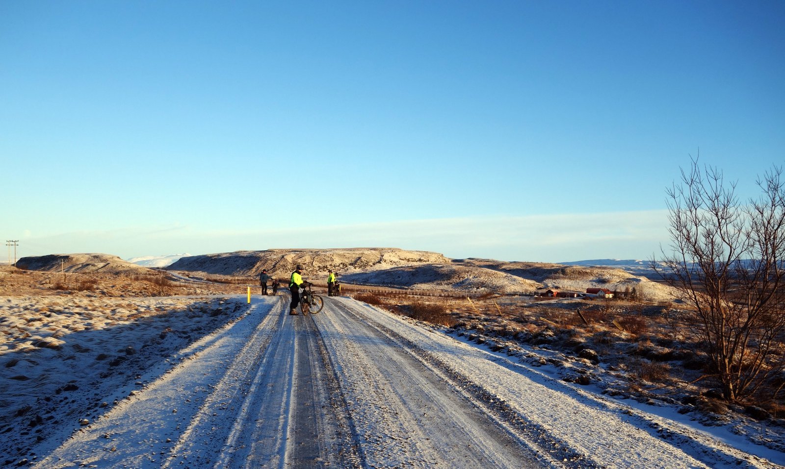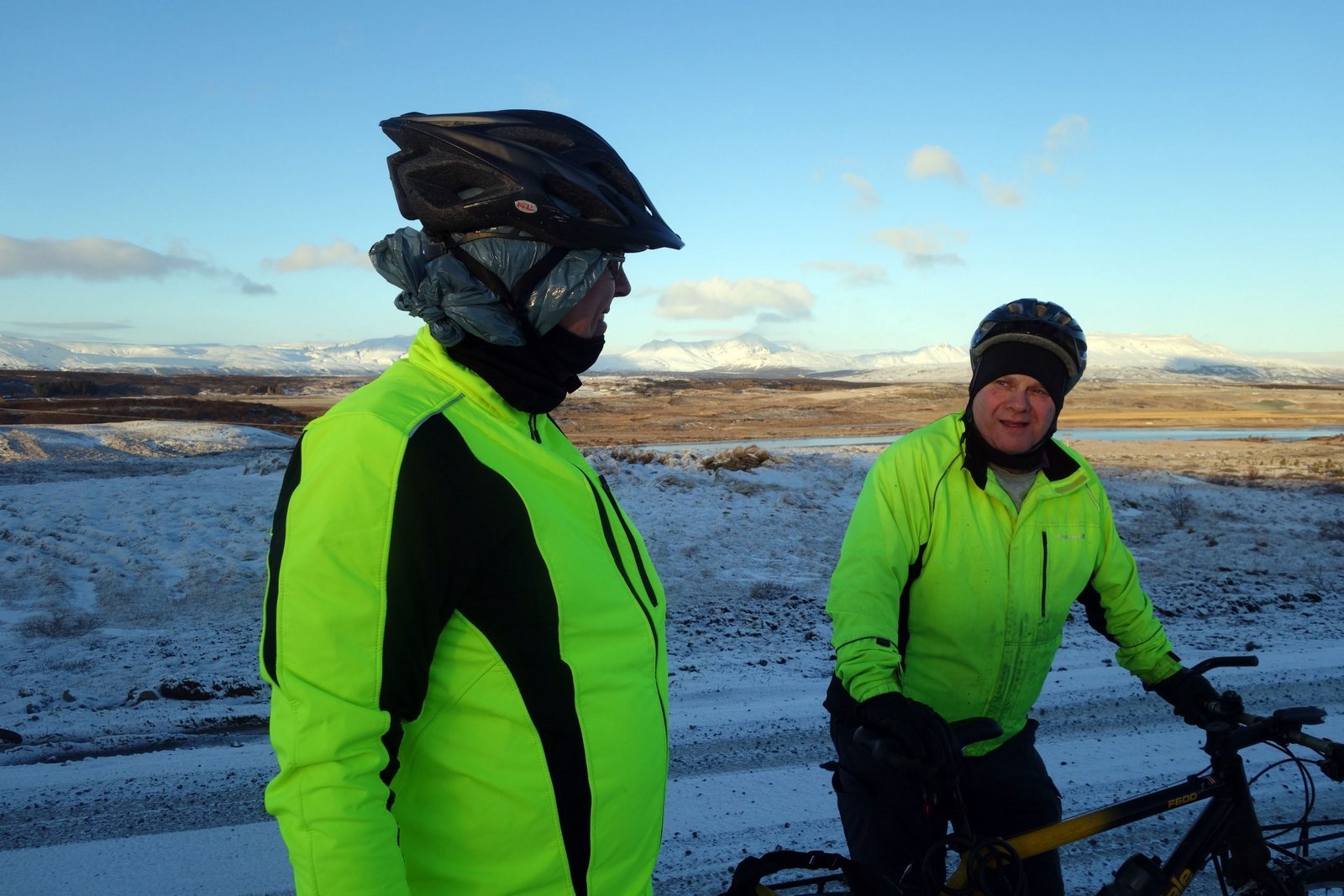 Laugardagur rann upp, bjartur og fagur. Fararstjórinn ekki göngufær en það er nú þannig með hjólreiðarnar, þær eru ívið léttari (gosh, þar fór harðjaxlalúkkið fyrir lítið) og eftir dagsferð á reiðhjóli hafði bólgan runnið að mestu úr hnénu. Plan D var nefnilega nokkurra kílómetra gönguferð. Ef það væri ófært til hjólreiða, en að vetrarlagi þarf að hafa þann varnagla í huga. Þegar við ætluðum að taka hjólin niður af bílunum kom í ljós að allir lásar voru frosnir og engin leið að opna þá. Eftir að Geysir café reddaði volgu vatni, þá tókst okkur að þýða lásana. Heitt vatn, hitabrúsi, lásasprey og plastpokar er komið á vetrar útbúnaðarlistann. Ekki tók betra við, bæði gírar og bremsur á hjólunum voru frosin. Sem betur fer var hjólaleið dagsins að mestu á jafnsléttu og því gekk að vera á hálfbremsulausu hjóli. En gírarnir eru annað mál. María þurfti að hætta við hjólaferðina, af því hjólið hennar var frosið fast í lágum gír. Elfa var ekki búin að fá hjólið sitt afhent og því fóru þær tvær í gönguferð um Geysissvæðið. Ávallt að hafa plan B, C og D þegar ferðast er að vetrarlagi. Talandi um plan B. Stundum verða óhöpp til góðs. Þegar við komum að bíl Sigga sem hafði verið skilinn eftir niðri við þjóðveg, þá kom í ljós að gluggi hafði verið skilinn eftir galopinn. Eins gott, því hurðarnar voru svo gaddfreðnar að hann varð að skríða inn um gluggann. Verst hvað hann var snöggur að því, afrekið náðist ekki á myndband.