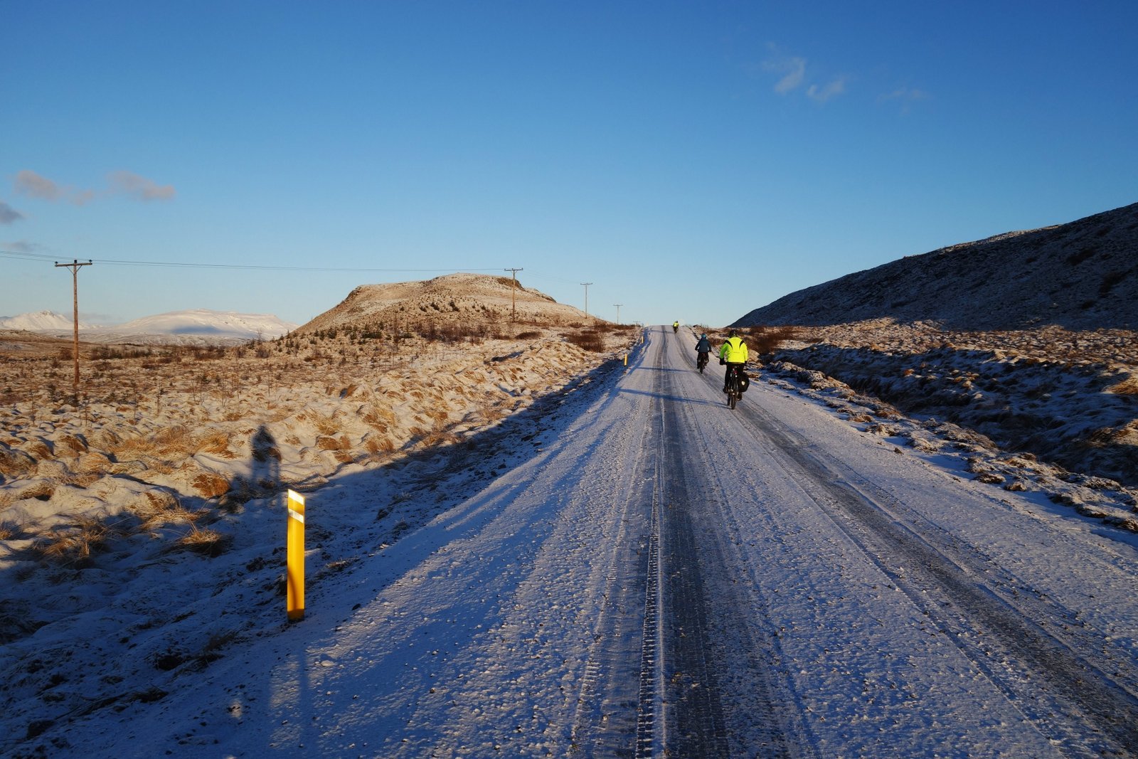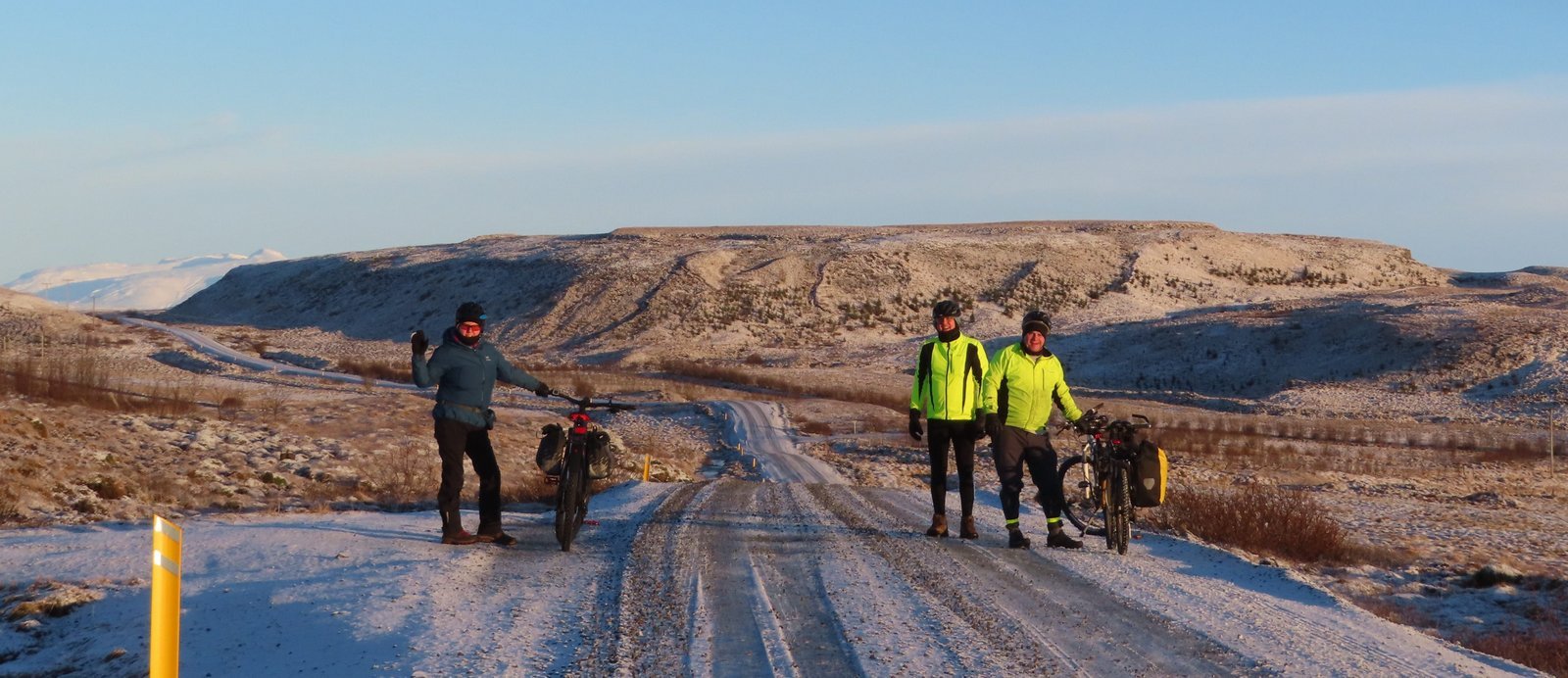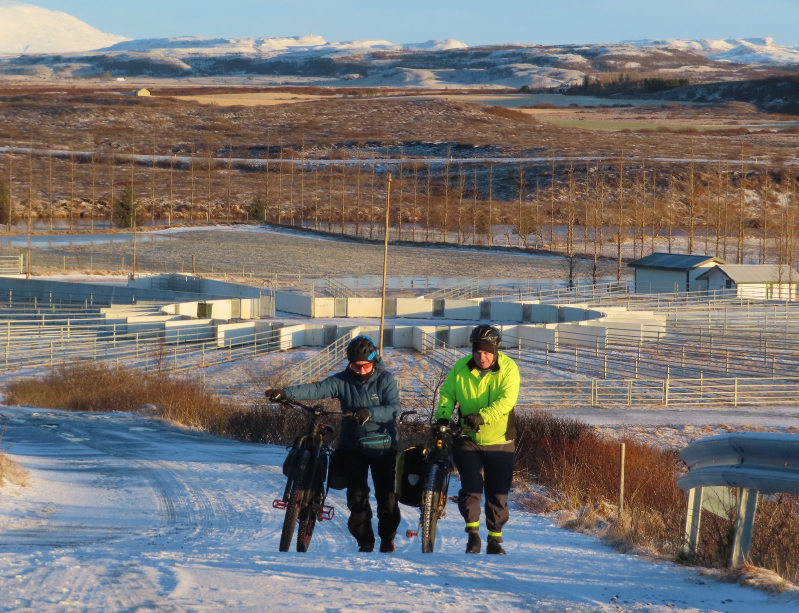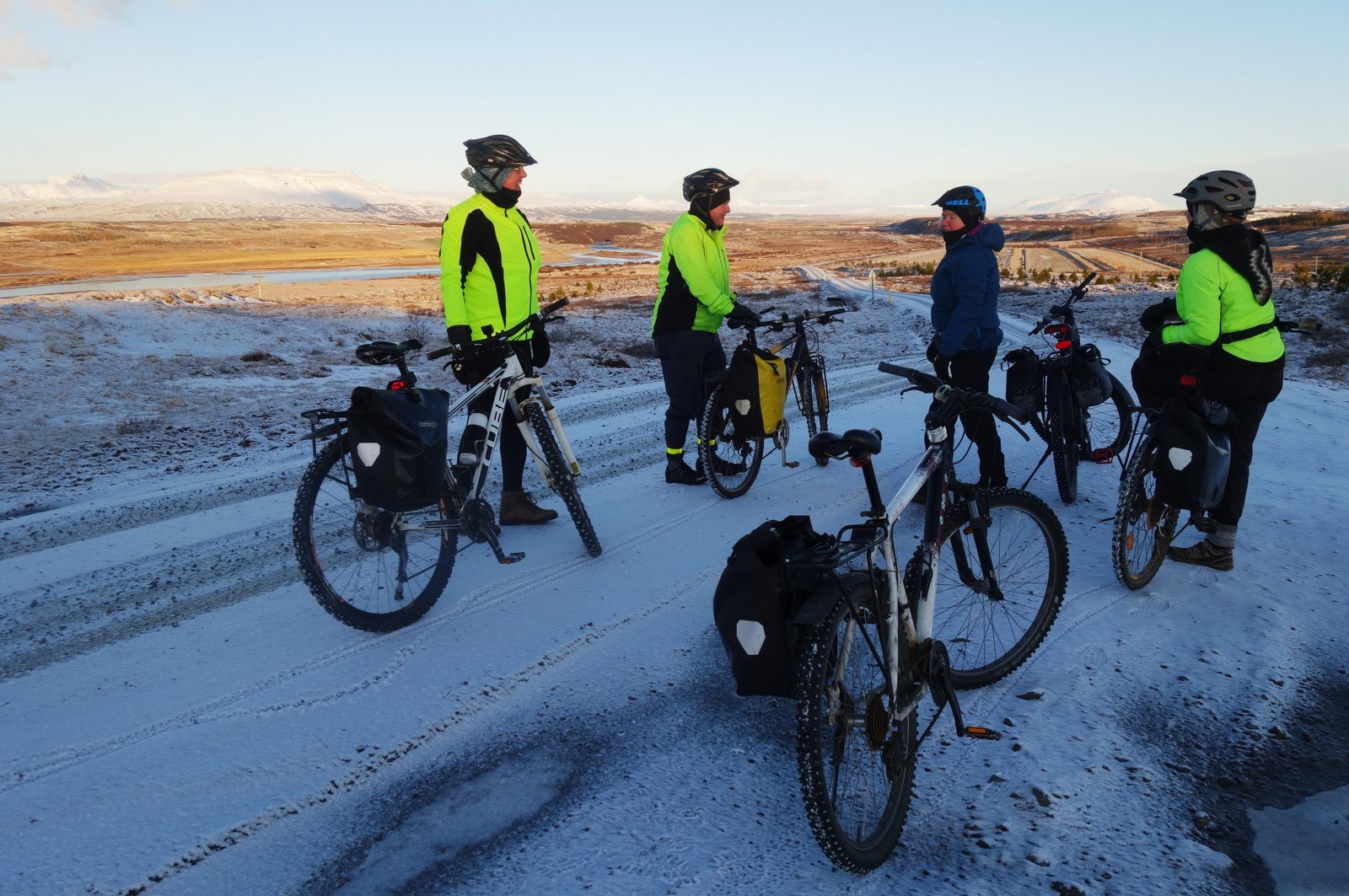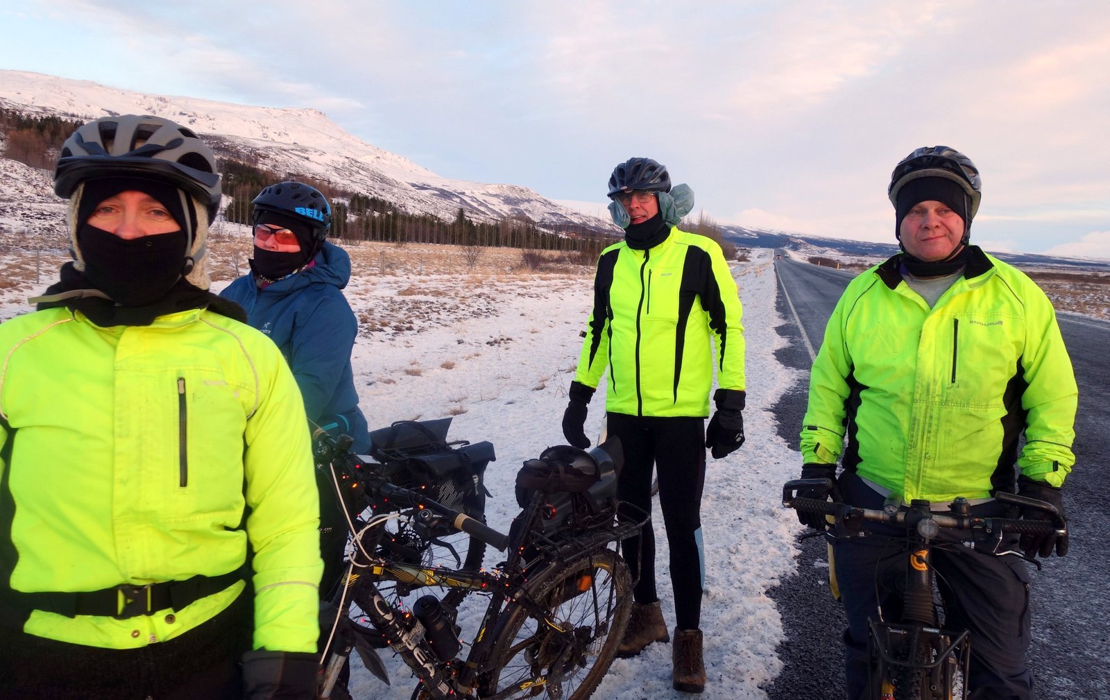 Laugardagur rann upp, bjartur og fagur. Fararstjórinn ekki göngufær en það er nú þannig með hjólreiðarnar, þær eru ívið léttari (gosh, þar fór harðjaxlalúkkið fyrir lítið) og eftir dagsferð á reiðhjóli hafði bólgan runnið að mestu úr hnénu. Plan D var nefnilega nokkurra kílómetra gönguferð. Ef það væri ófært til hjólreiða, en að vetrarlagi þarf að hafa þann varnagla í huga. Þegar við ætluðum að taka hjólin niður af bílunum kom í ljós að allir lásar voru frosnir og engin leið að opna þá. Eftir að Geysir café reddaði volgu vatni, þá tókst okkur að þýða lásana. Heitt vatn, hitabrúsi, lásasprey og plastpokar er komið á vetrar útbúnaðarlistann. Ekki tók betra við, bæði gírar og bremsur á hjólunum voru frosin. Sem betur fer var hjólaleið dagsins að mestu á jafnsléttu og því gekk að vera á hálfbremsulausu hjóli. En gírarnir eru annað mál. María þurfti að hætta við hjólaferðina, af því hjólið hennar var frosið fast í lágum gír. Elfa var ekki búin að fá hjólið sitt afhent og því fóru þær tvær í gönguferð um Geysissvæðið. Ávallt að hafa plan B, C og D þegar ferðast er að vetrarlagi. Talandi um plan B. Stundum verða óhöpp til góðs. Þegar við komum að bíl Sigga sem hafði verið skilinn eftir niðri við þjóðveg, þá kom í ljós að gluggi hafði verið skilinn eftir galopinn. Eins gott, því hurðarnar voru svo gaddfreðnar að hann varð að skríða inn um gluggann. Verst hvað hann var snöggur að því, afrekið náðist ekki á myndband.