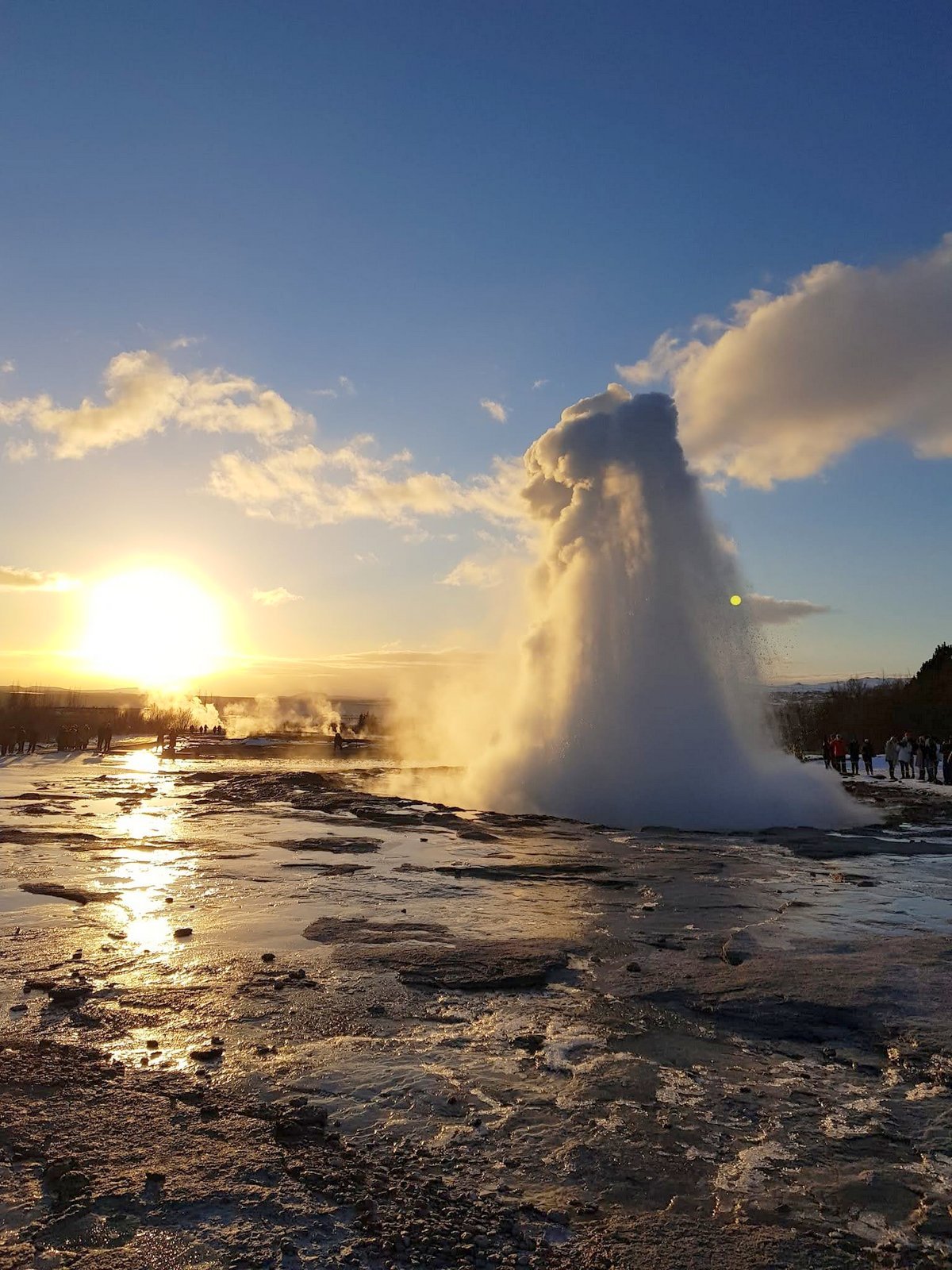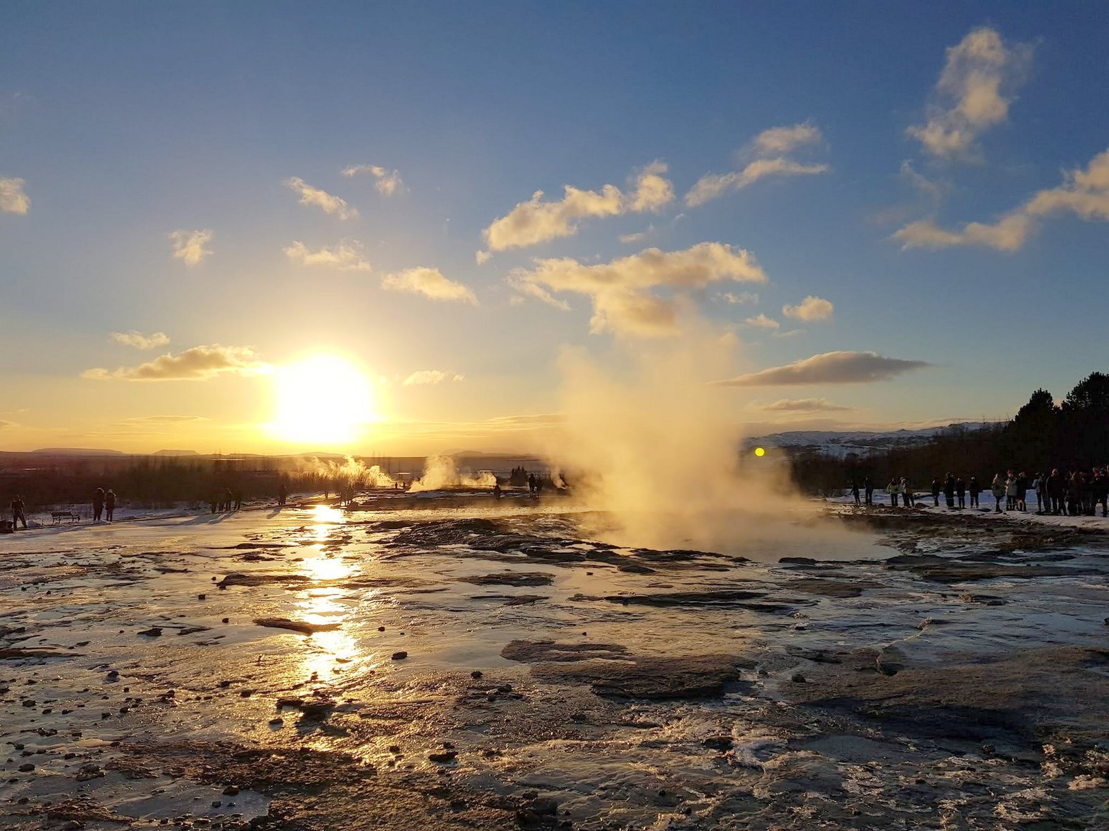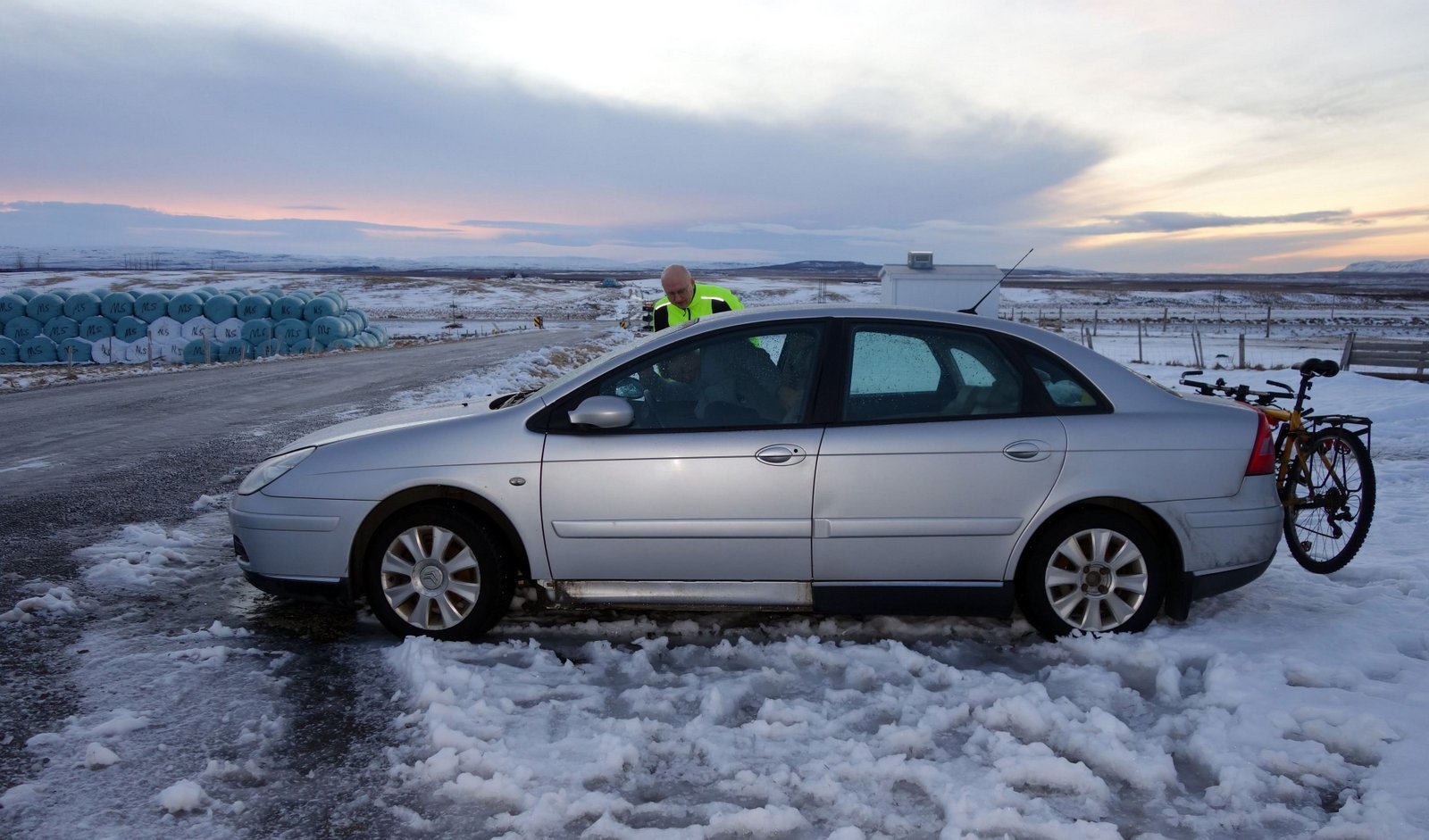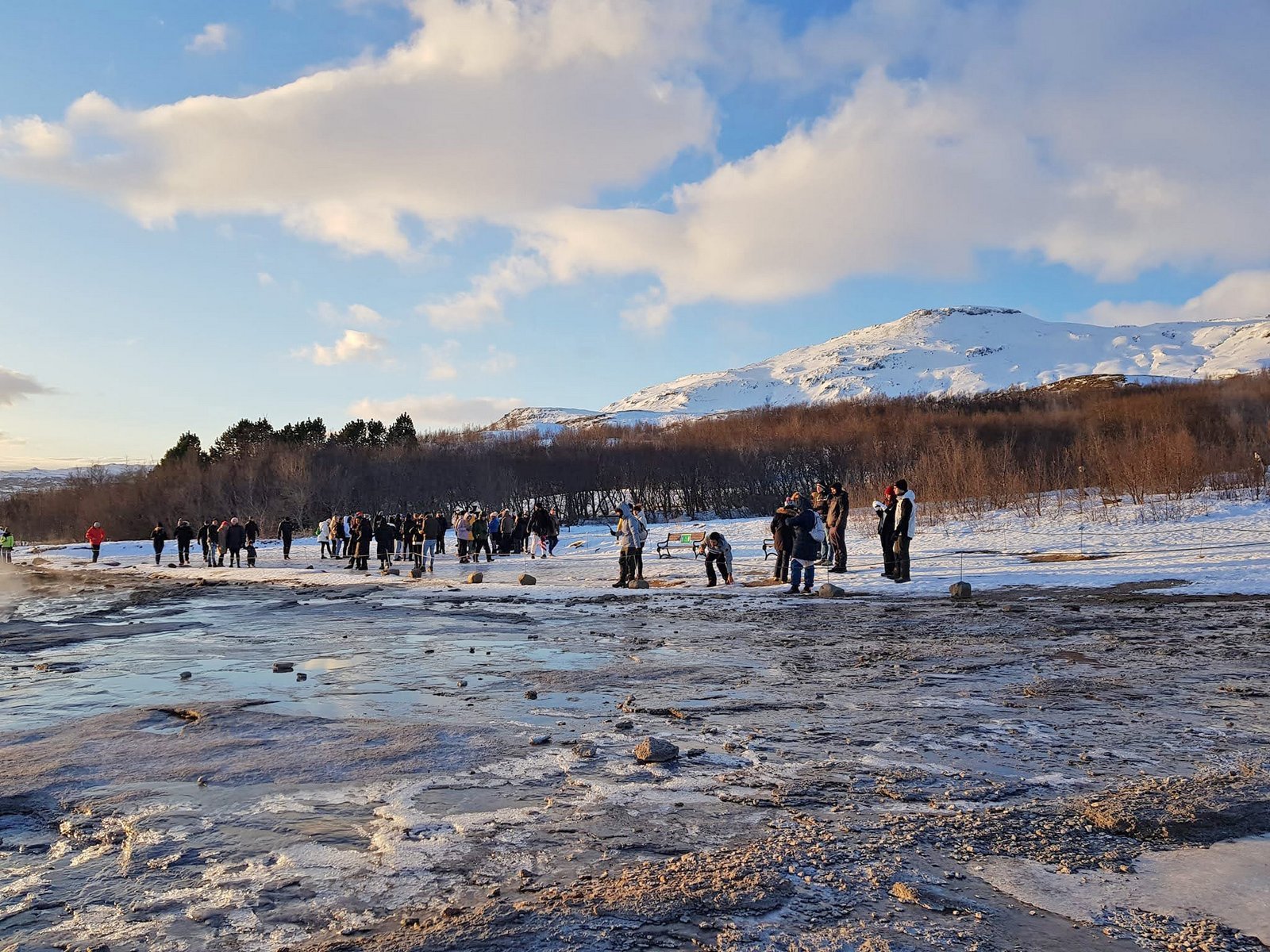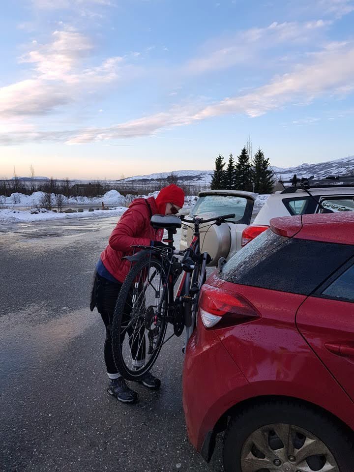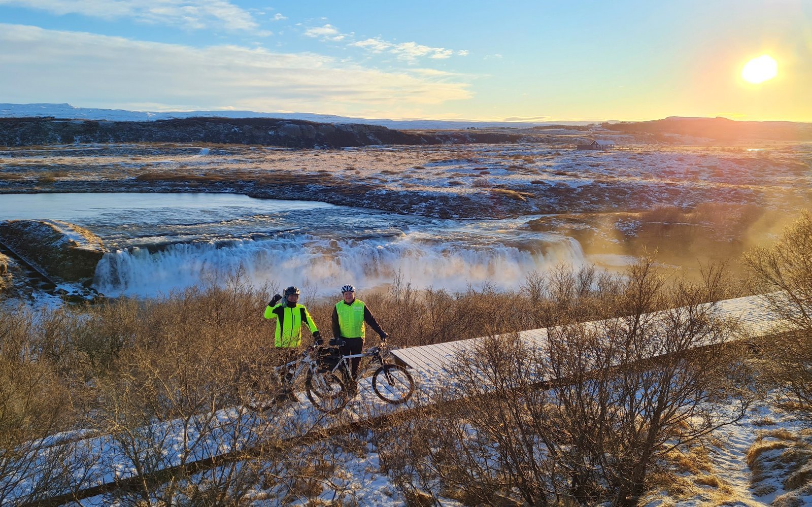 Laugardagur rann upp, bjartur og fagur. Fararstjórinn ekki göngufær en það er nú þannig með hjólreiðarnar, þær eru ívið léttari (gosh, þar fór harðjaxlalúkkið fyrir lítið) og eftir dagsferð á reiðhjóli hafði bólgan runnið að mestu úr hnénu. Plan D var nefnilega nokkurra kílómetra gönguferð. Ef það væri ófært til hjólreiða, en að vetrarlagi þarf að hafa þann varnagla í huga. Þegar við ætluðum að taka hjólin niður af bílunum kom í ljós að allir lásar voru frosnir og engin leið að opna þá. Eftir að Geysir café reddaði volgu vatni, þá tókst okkur að þýða lásana. Heitt vatn, hitabrúsi, lásasprey og plastpokar er komið á vetrar útbúnaðarlistann. Ekki tók betra við, bæði gírar og bremsur á hjólunum voru frosin. Sem betur fer var hjólaleið dagsins að mestu á jafnsléttu og því gekk að vera á hálfbremsulausu hjóli. En gírarnir eru annað mál. María þurfti að hætta við hjólaferðina, af því hjólið hennar var frosið fast í lágum gír. Elfa var ekki búin að fá hjólið sitt afhent og því fóru þær tvær í gönguferð um Geysissvæðið. Ávallt að hafa plan B, C og D þegar ferðast er að vetrarlagi. Talandi um plan B. Stundum verða óhöpp til góðs. Þegar við komum að bíl Sigga sem hafði verið skilinn eftir niðri við þjóðveg, þá kom í ljós að gluggi hafði verið skilinn eftir galopinn. Eins gott, því hurðarnar voru svo gaddfreðnar að hann varð að skríða inn um gluggann. Verst hvað hann var snöggur að því, afrekið náðist ekki á myndband.