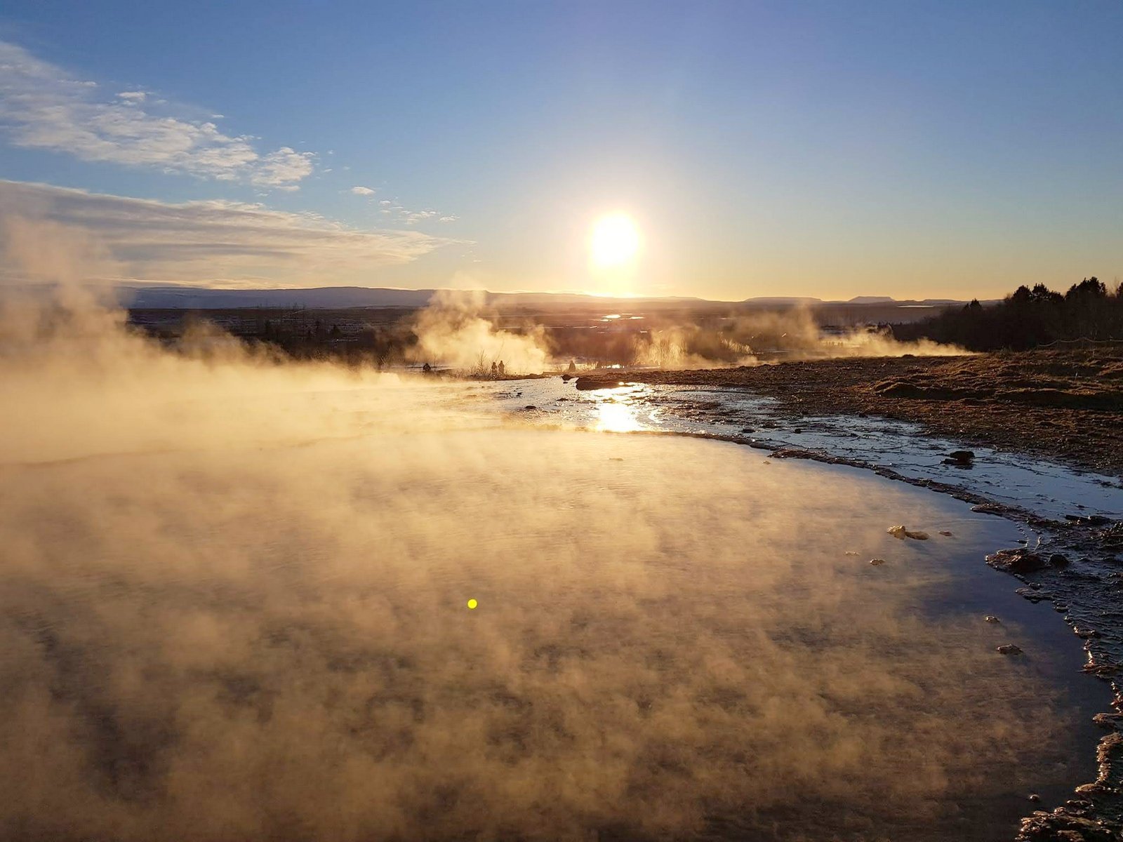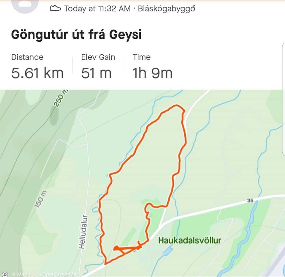 Planið var að hjóla 26 km hring út frá Geysi, en hér verður lenging upp á 15 km að skrifast á vanþekkingu fararstjóra á svæðinu, við misstum af brúnni. Sem betur fer kom önnur brú, annars værum við kannski enn á Flúðum. Við byrjuðum hringinn í blússandi meðvindi og svo datt hann niður í dúnalogn og við kláruðum hringinn í brakandi blíðu og gríðarlega fallegu útsýni. Algjörlega andstætt öllum lögmálum, en það er algengara að hann snúi sér, þannig að maður byrjar hringleið í mótvindi og endar í mótvindi.