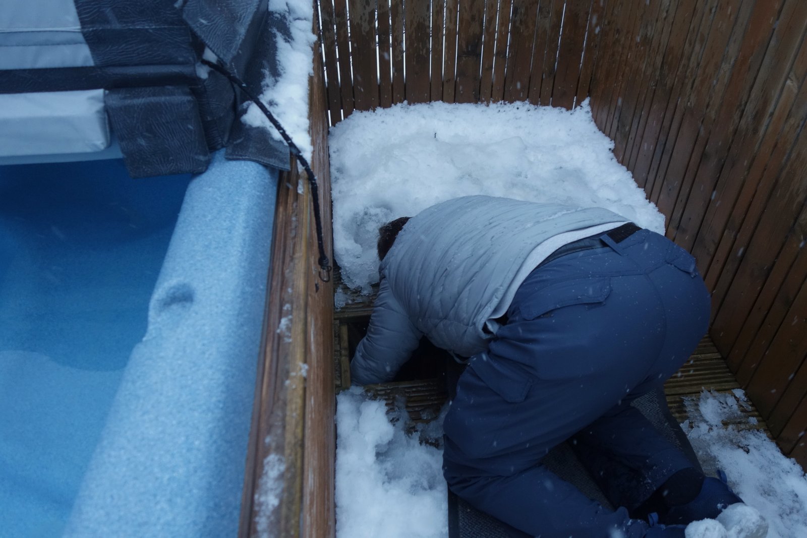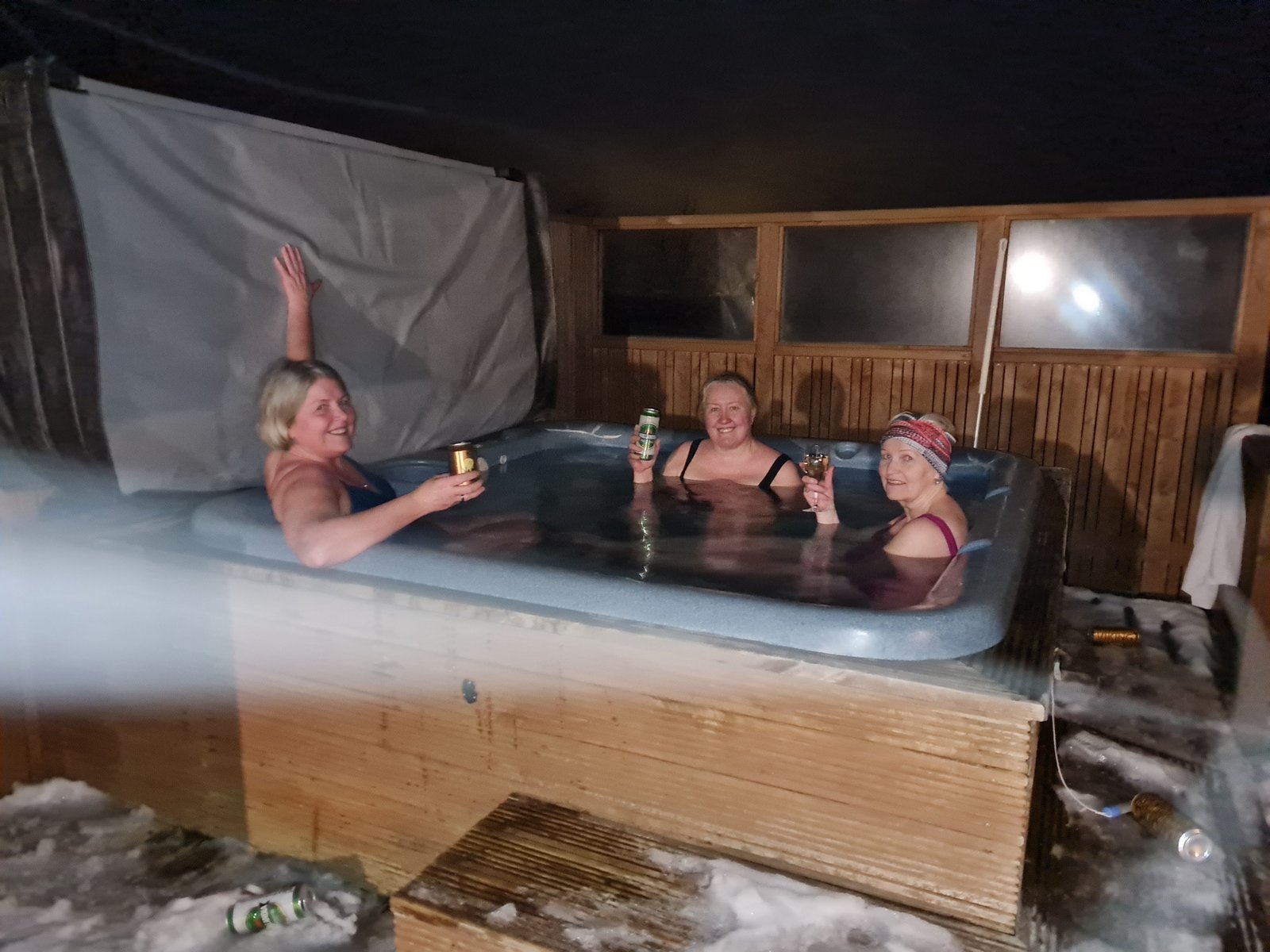 Þegar allir voru mættir og búnir að koma sér fyrir var ákveðið að prófa heita pottinn. Hófst þá leitin að tappanum, eða réttara sagt handfanginu sem myndi loka fyrir rennslið úr pottinum. Það tók ekki nema klukkutíma og 3 aðila. Samt voru leiðbeiningar í bústaðnum. Það var hleri við hliðina á pottinum (ekki undir honum eins og sagði í leiðbeiningunum) sem hafði fennt yfir. Þegar fara átti í pottinn var hann allt of heitur, kalda vatnsslangan virkaði ekki en það var nóg af snjó til að moka ofan í. Svo við komumst loks ofan í pottinn og dóluðum þar fram eftir kvöldi. En þegar sú er þetta ritar ætlaði inn í hús rann hún til í vatnspolli, fótleggurinn (með gervihné) bögglaðist saman og afraskur byltunnar var bólgið og verkjað hné. Verst að sú fallna var fararstjórinn, og því óheppilegt að vera ekki hjóla- eða göngufær næsta dag.
