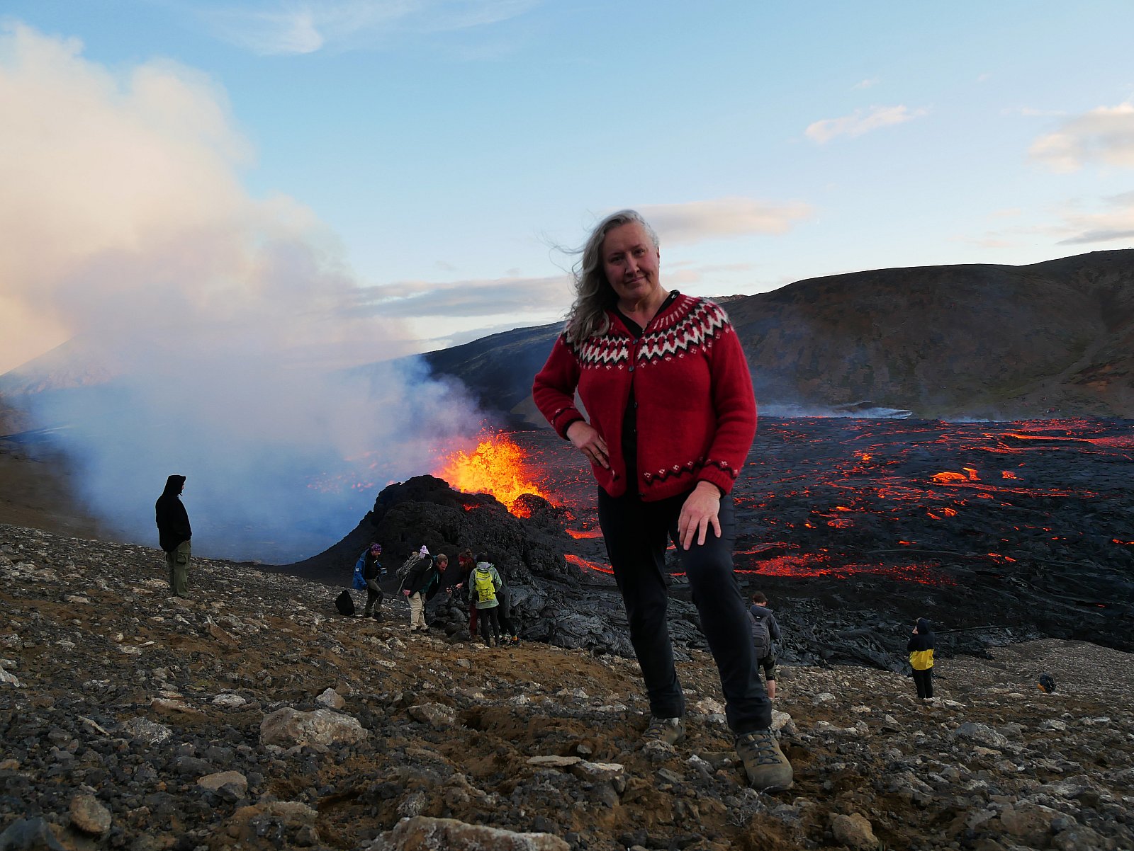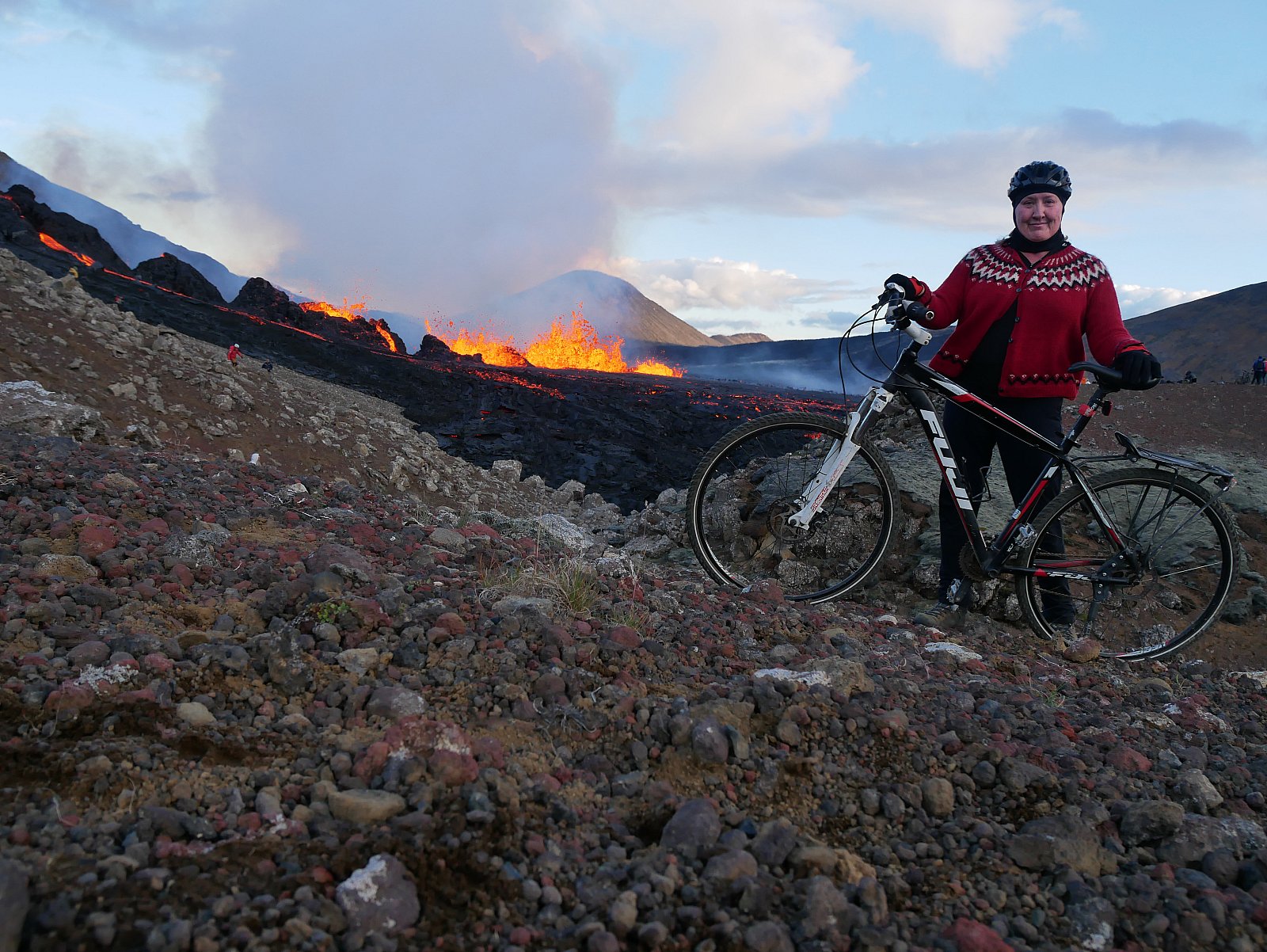 Ég ætlaði að vera þarna fram í myrkur og hjóla svo heim um miðja nótt. En æ... hjólaljósin urðu eftir heima á náttborðinu. Ég stakk þeim í samband til að vera örugg um að það væri næg hleðsla á þeim. Svo bara gleymdust þau í æsingnum yfir gosinu. Ég varð að hjóla til baka á meðan ég hafði einhverja birtu. Ég var í góðum endurskinsfatnaði og sem betur fer með vara-vara ljósin, stórmarkaðsljós sem lýsa mér ekki, en aðrir vegfarendur sáu mig.