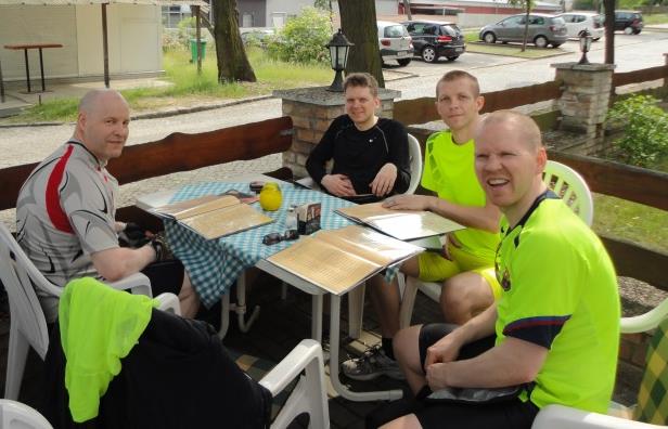 Í Finsterwalde byrjuðum við á að kaupa kort af Tékklandi en menn skiptust á að kaupa kort til að dreifa kostnaðnum. Virkilega gott system hjá okkur. Við stoppuðum svo við stórt torg á ítölskum veitingastað, menn fengu sér pizzu eða pasta og bjór með.