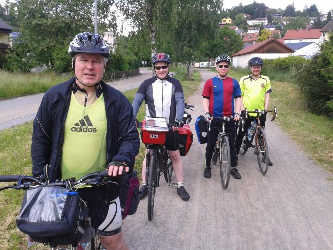 Landamærin sjálf voru ekki merkileg. Við fórum yfir litla brú yfir lækjarsprænu og vorum komnir inn í Tékkland. Strax við landamærin var fyrsta alvöru brekk ferðarinnar, en við vorum búnir að sjá á korti að það er fjallgarður sem skilur Þýskaland og Tékkland að. Við fórum hæst í 851 m. Þetta var sæmilega erfitt á meðan á því stóð. Að vísu var fjallið ekkert sérlega bratt, en þetta var klárlega mesta áreynsla ferðarinnar fram að þessu. Eftir á, þar sem ég skrifa þessa sögu, var þetta bara létt og þægilegt.