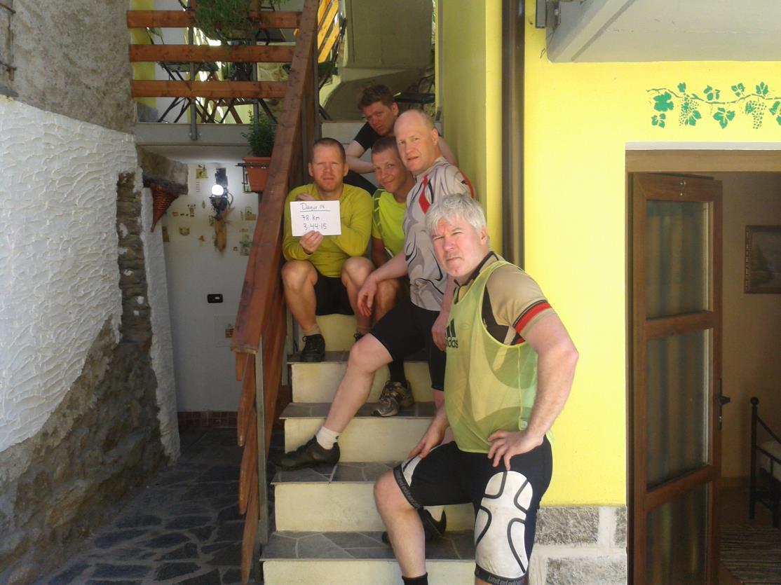Þetta gekk annars fínt og við vorum komnir til Traona, 2500 manna bæjar skammt frá Morbegno, um kl. 16:00. Það hafði orðið einhver misskilningur með bókun okkar á www.booking.com en sem betur fer voru herbergin enn laus, þrátt fyrir að þetta væri ansi lítið gistiheimili. Gistiheimilið heitir Le Cantine Del Vecchio Borgo og líkt og í Davos þurftum við að taka aðeins á honum stóra okkar þar sem það var í miðri fjallshlíð. Okkar herbergi var sæmilega rúmgott, en bara tvö sæmilega stór rúm. Svavar og Júlli deildu hins vegar ansi litlu rúmi.