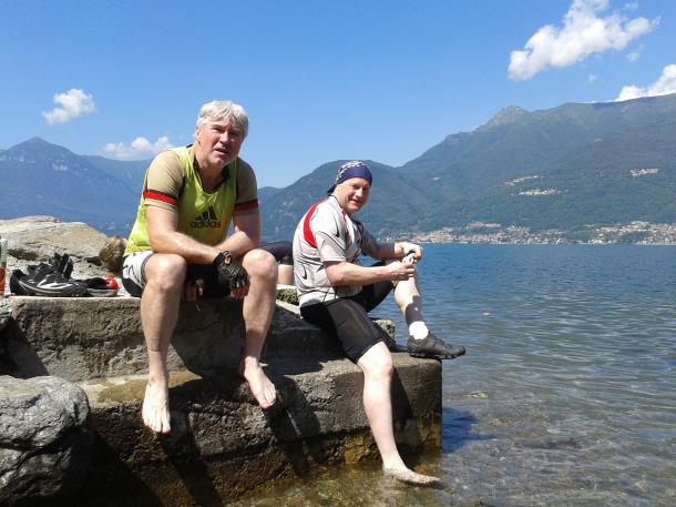 Við byrjuðum svo á því að hjóla beint í vestur, út þennan dal sem við höfðum verið að hjóla daginn áður, í áttina að Como vatni. Eftir um 15 km. vorum við komnir að vatninu en þá vorum við í bænum Colico Piano. Þetta voru þægilegir 15 km, smá lækkun, á hjólastígum og veðrið var frábært. Við stoppuðum í búð í bænum áður en við héldum áfram.
