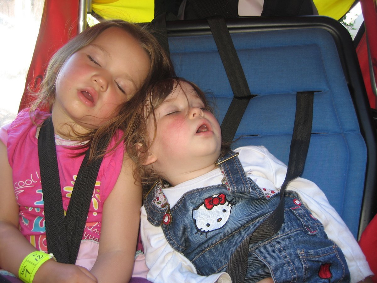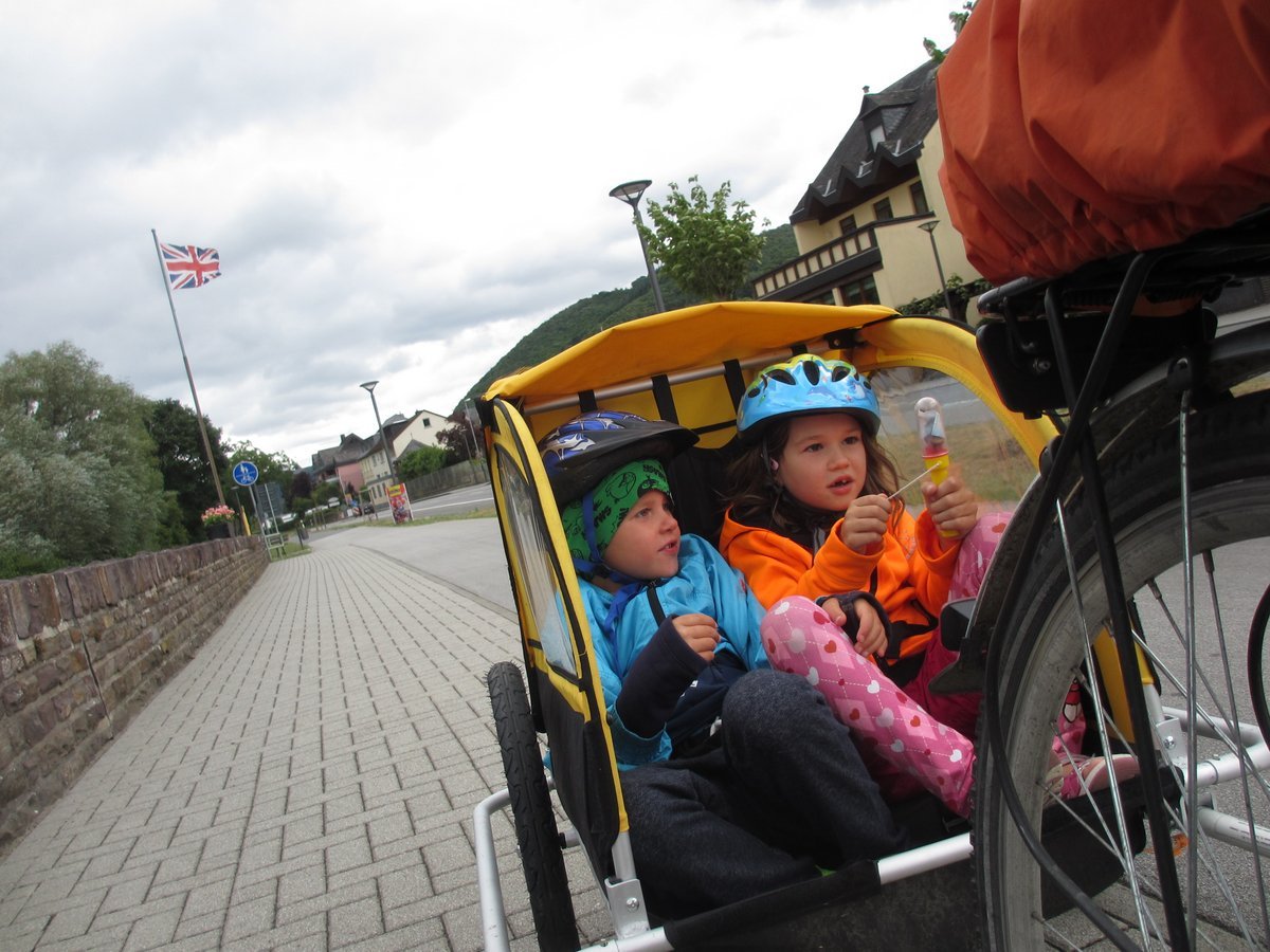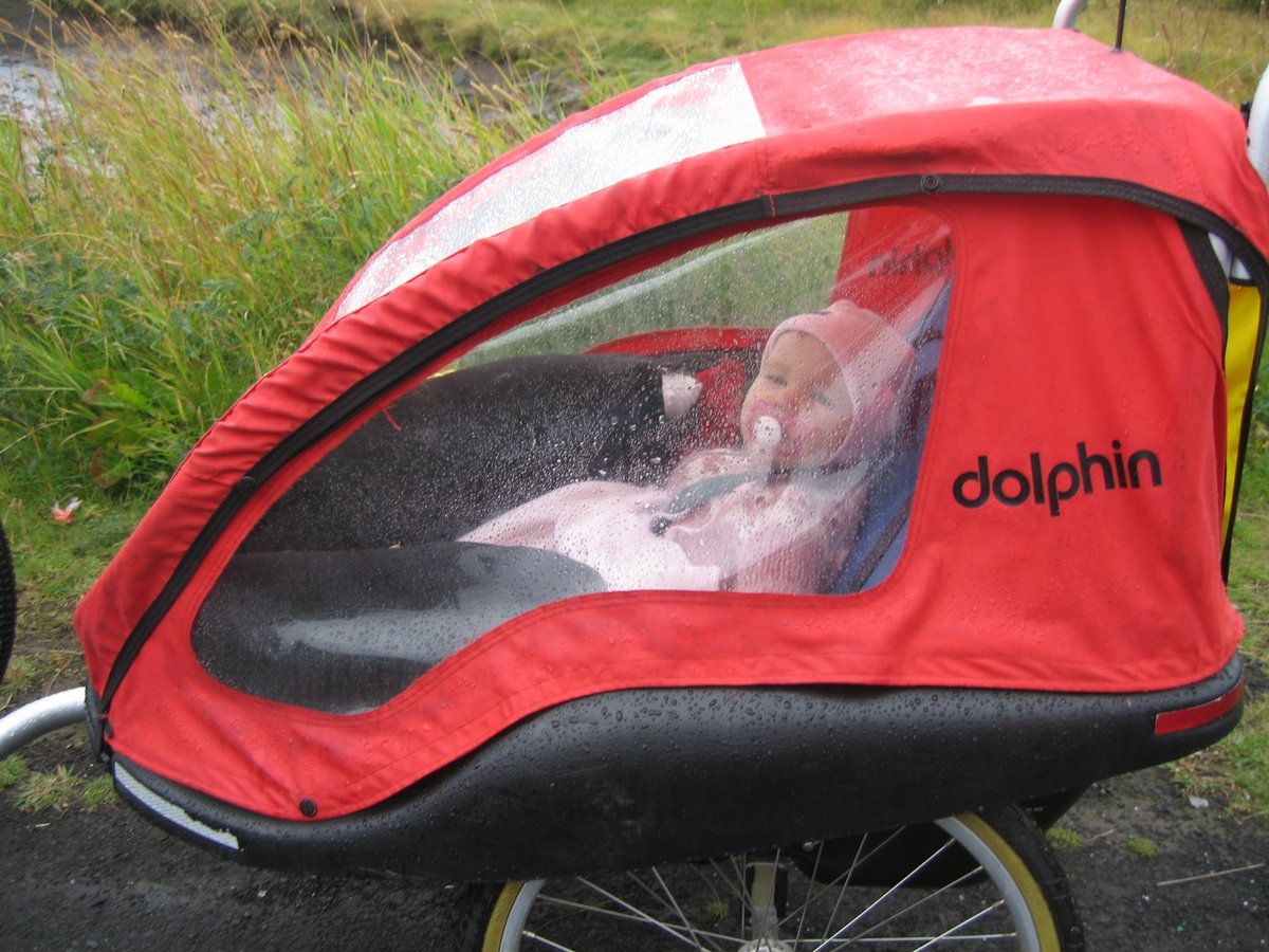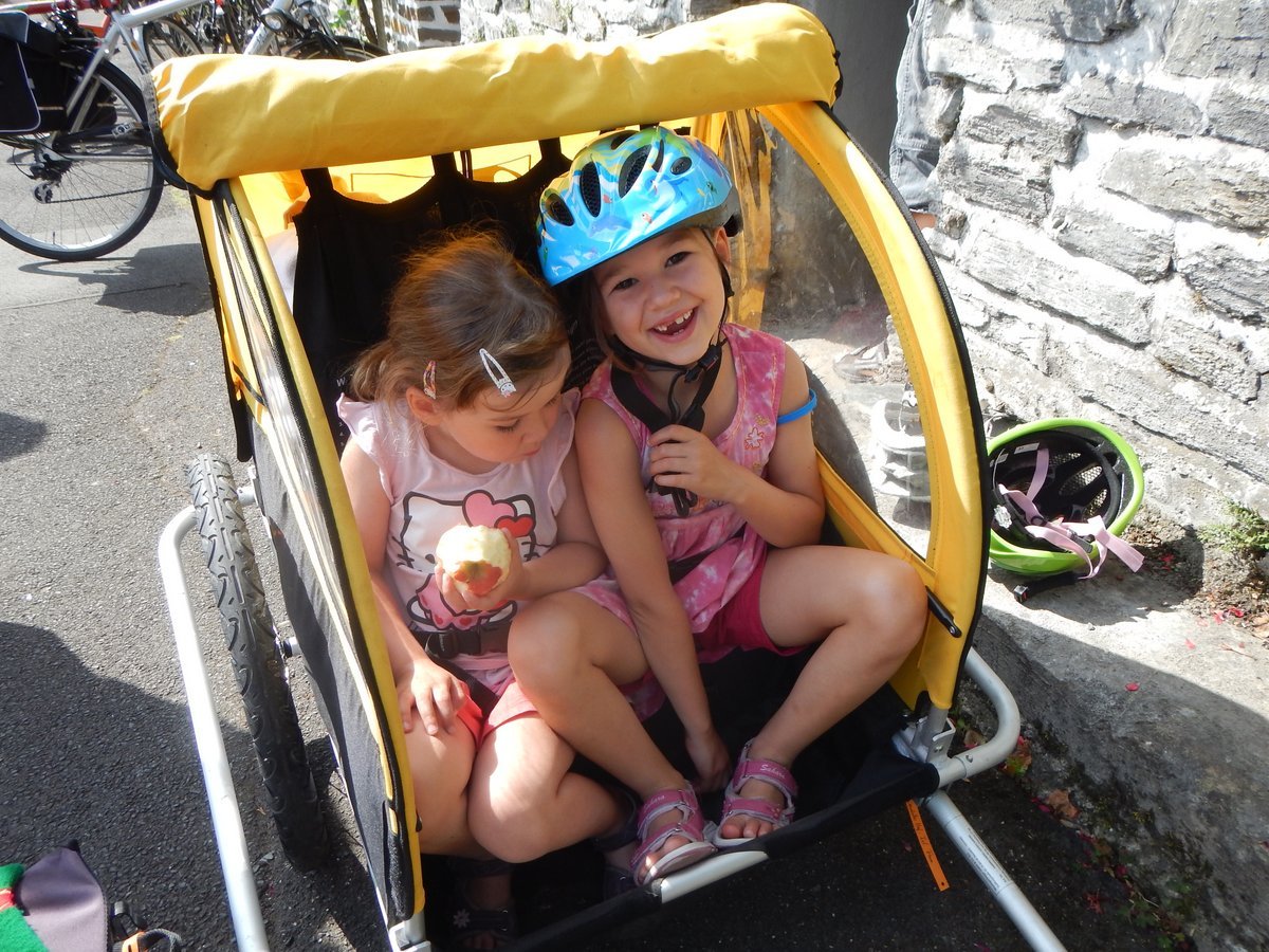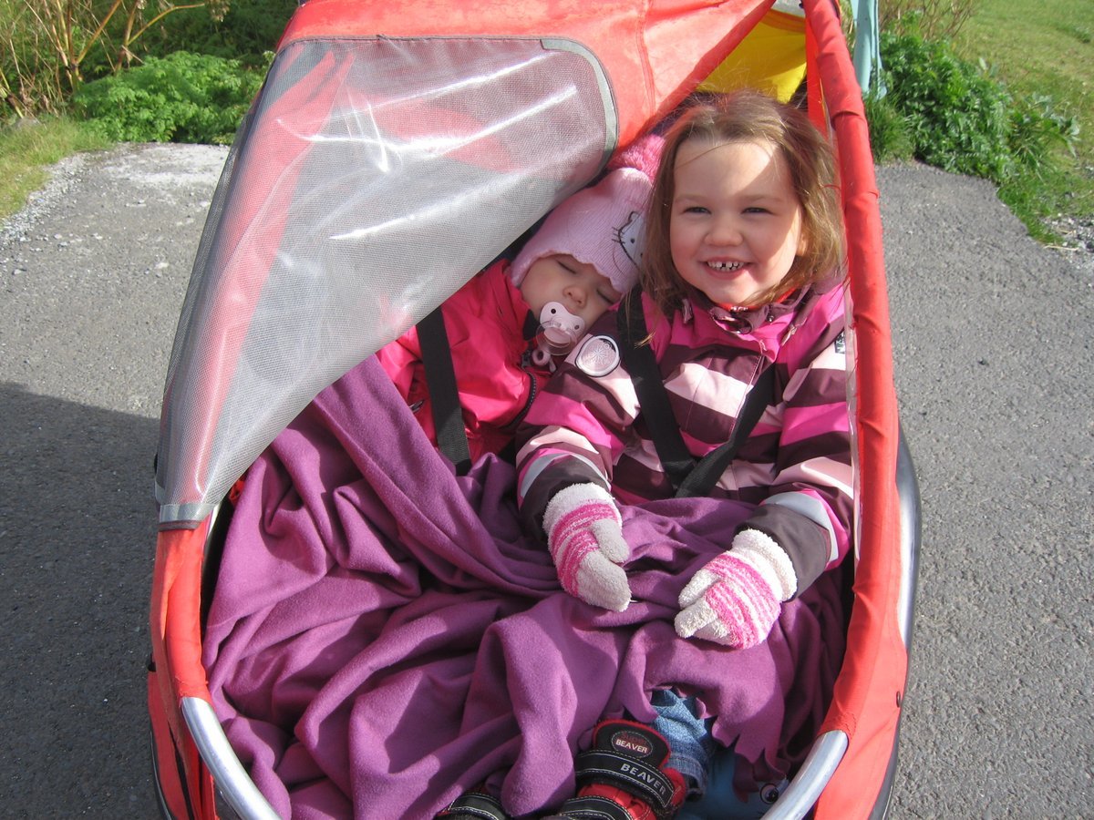 Dæturnar fæddust báðar í nóvember og ég var ekkert að flýta mér af stað að prófa vagninn. Þær voru því orðnar átta mánaða gamlar þegar þær fengu fyrstu ferðina í vagninum. Ég hafði ekki keypt innlegg í vagninn en notaði þess í stað púða, trefla og teppi til að skorða þær af, og svo hjólaði ég auðvitað lúshægt og mjög varlega. Stóllinn var ekki prófaður fyrr en löngu seinna enda verða börnin að geta haldið vel höfði og að sjálfsögðu vera með hjálm þar sem þau eru jafn óvarin og sá sem hjólar með þau.
