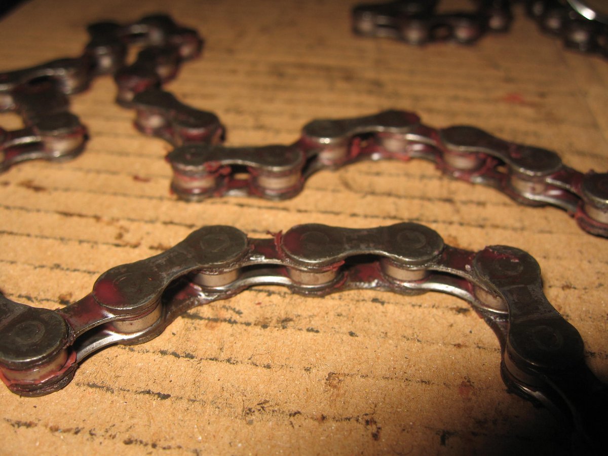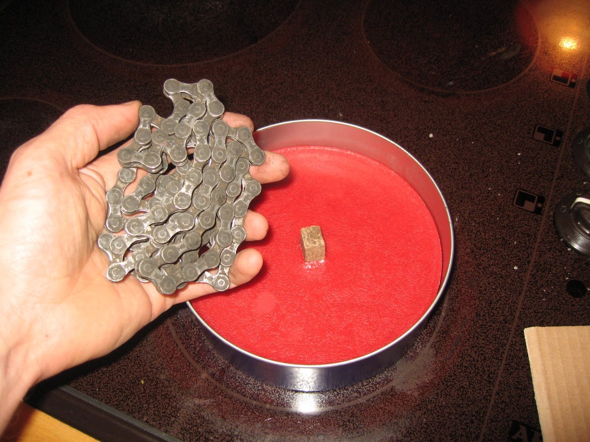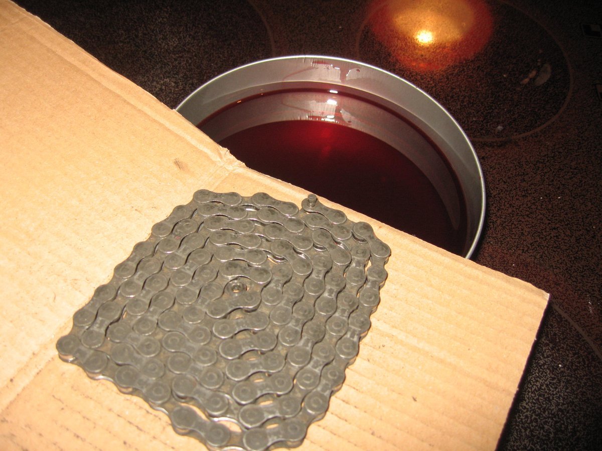 Fyrir nokkru gerði ég tilraun með að nota kertavax til að verja keðjuna. Það kom á óvart hvað það virist virka vel og lengi en brasið, subbuskapurinn og vinnan við það fær mann til að efast um hvort það borgi sig. En svona fór ég að: ég tók útikerti þar sem mér fannst vaxið í þeim feitara. Það var í hentugri málmdós sem ég setti einfaldlega á eldavélarhellu á lágan hita í smá stund. Þegar allt vaxið var bráðið veiddi ég kveikinn uppúr og setti keðjuna hreina, þurra og upprúllaða varlega ofaní. Í smá stund á eftir komu litrar loftbólur út úr hlekkjunum. Þegar þær hættu að koma notaði ég vír til að veiða keðjuendann uppúr og lét hanga yfir pottinum til að það mesta gæti lekið af keðjunni. Svo þegar hún kólnaði var hún stíf eins og prik og ég fór að efast um að þetta væri sniðugt. Með smá brasi og ofbeldi þræddi ég stífa keðjuna upp í gegnum skiptinn og á sinn stað, setti keðjulásinn saman og snéri. Þetta var stíft í kannski 5 hringi og varð þá ljúft og liðugt á ný. Með þetta svona hjólaði ég nokkur hundruð kílómetra í snjó og saltslabbi á eftir án þess að gera nokkuð. Svo smurði ég seint og síðarmeir með keðjuolíu þegar kom smá ískur. Mér fannst líða lengur á milli þess sem ég smurði fyrst á eftir og er það kenning mín að vaxið haldi olíunni betur inni í keðjunni og óhreinindunum úti. Ég verð þó að vara við að það er varasamt að bræða vax á þennan hátt og auðvelt að brenna sig. Keðjan verður líka að vera þurr og hrein til að minnka líkur á vatns-sprengingu ofaní vaxinu sem getur skvettst yfir mann. Þessi tilraun var ekki vísindaleg og engar mælingar né skráningar gerðar um smurningar eða tegundir olía á eftir enda einungis til gamans gert. Ég veit ekki hvort ég mæli með þessu fyrir hvern sem er, en ég á eftir að gera þetta aftur í vetur til að verja mína keðju. Einfaldast er að smyrja oft og reglulega með þunnri keðjuolíu helst með tefloni í sem freyðir.